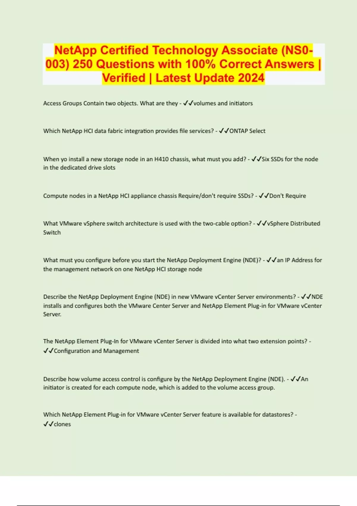 NetApp Certified Technology Associate (NS0- 003) 250 Questions with 100% Correct Answers | Verified | Latest Update 2024 | 26 Pages