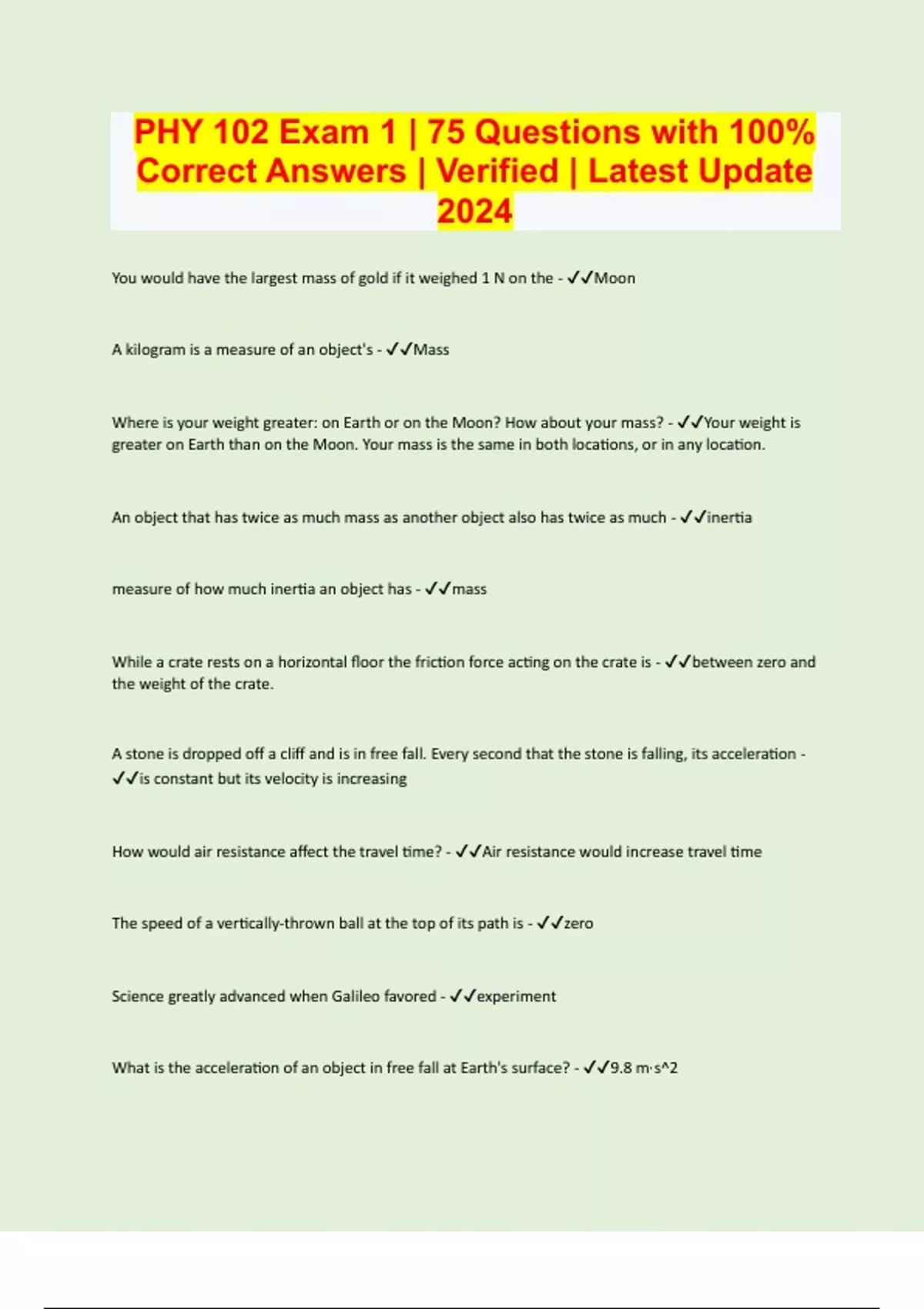 PHY 102 Exam 1 | 75 Questions with 100% Correct Answers | Verified | Latest Update 2024