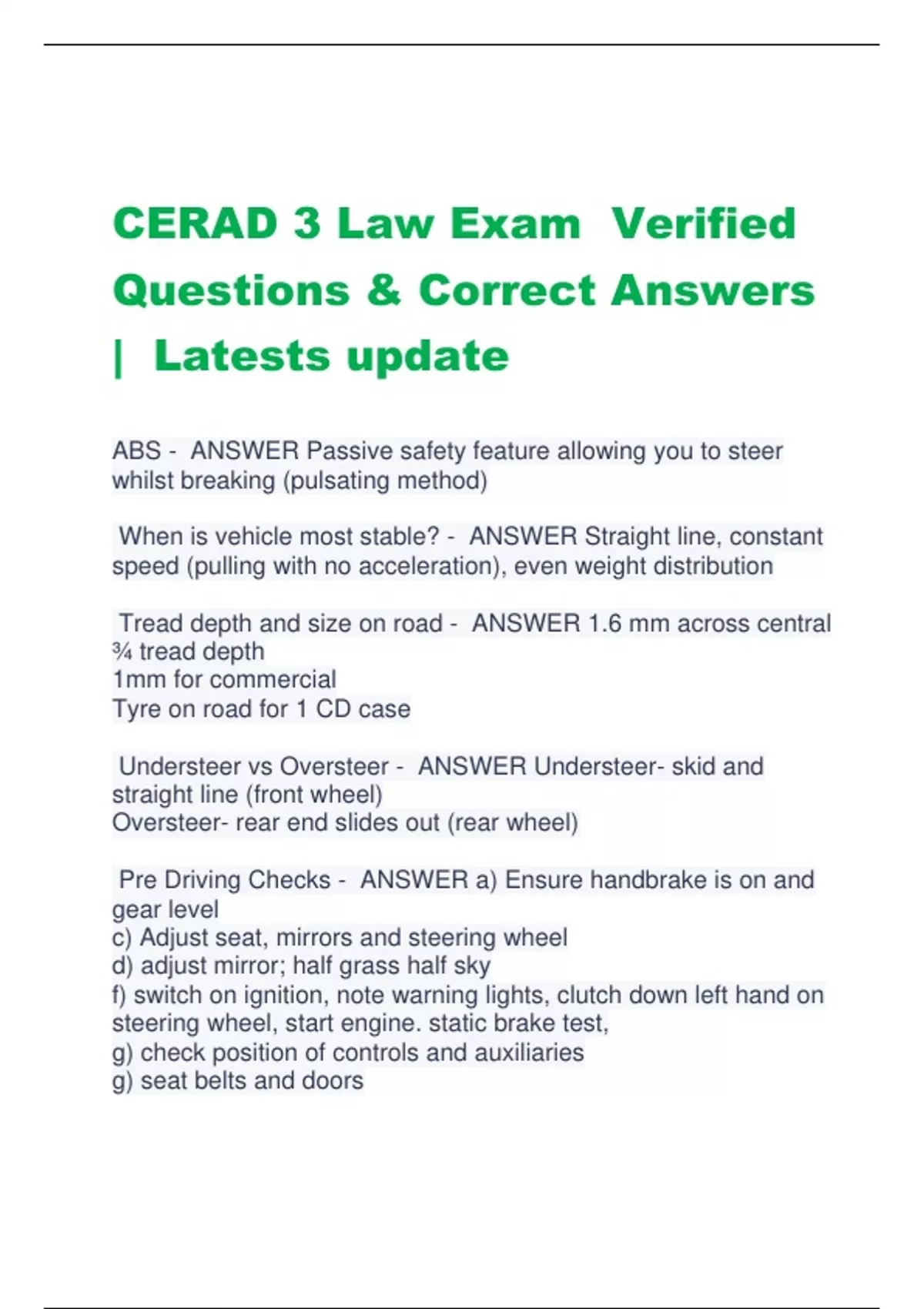 CERAD 3 Law Exam Verified Questions & Correct Answers | Latests update ABS - ANSWER Passive safety feature allowing you to steer whilst breaking (pulsating method) When is vehicle most stable? - ANSWER Straight line, constant speed (pulling with no acceleration), even weight distribution Tread depth and size on road - ANSWER 1.6 mm across central ¾ tread depth 1mm for commercial Tyre on road for 1 CD case Understeer vs Oversteer - ANSWER Understeer- skid and straight line (front wheel) Oversteer- rear end slides out (rear wheel) Pre Driving Checks - ANSWER a) Ensure handbrake is on and gear level c) Adjust seat, mirrors and steering wheel d) adjust mirror; half grass half sky f) switch on ignition, note warning lights, clutch down left hand on steering wheel, start engine. static brake test, g) check position of controls and auxiliaries g) seat belts and doors h) 15mph brake test- alert passengers, ensure no swerve or funny noises Positioning - ANSWER View, Stability, Safety C1 licence terms - ANSWER Every 5 years renew medical declaration via DVLA Over 45- renew licence via medical every 5 years Grandfather rights- once 70 every 3 years Steps to combat fatigue - ANSWER 1)Coffee 2 shots of caffeine 2)Fresh air 3) Energy drink 4)Brisk walk 5) 15 minute nap 6) Stop in a safe place 7)Seat position and PDC Fatigue - ANSWER More likely to suffer over 45 yrs More tired between Points of licence - ANSWER Dangerous driving- £200 fine and 6 points 12 points, min 6 months ban or longer Over 6 in ambulance service Phone use- 6 points and £1000 fine Responsibility of driver to keep up knowledge or the HWX Positive responces - ANSWER 1)Moving left 2)looking in mirrors 3)slowing down 4)indicating left Safe cornering - ANSWER 1)Correct position 2)Correct speed for corner identified 3)Correct gear selection throughout 4)Able to stop safely within distance you can see to be clear on your side of the road 5)Acceleration Vehicle condition - ANSWER Keep vehicle and tyres in good condition and keep pressures to recommended level Cornering Forces - ANSWER Steering, acceleration and braking The more you brake/accelerate, the less grip you have for steering The faster you travel into a bend, the less stability -skid Cambers - ANSWER Crown= dome shaped road (left hand turn increases steering capability) Superelevation= width is banked up towards edge of bend Factors Affecting Cornering - ANSWER Speed Specification of vehicle Steering Acceleration Braking Road slope Road surface Weather Tyres Limit Point - ANSWER furthest point to which you have an interrupted view of road surfa