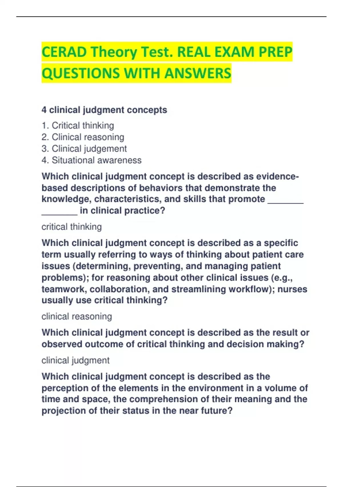 CERAD Theory Test. REAL EXAM PREP QUESTIONS WITH ANSWERS 4 clinical judgment concepts 1. Critical thinking 2. Clinical reasoning 3. Clinical judgement 4. Situational awareness Which clinical judgment concept is described as evidencebased descriptions of behaviors that demonstrate the knowledge, characteristics, and skills that promote _______ _______ in clinical practice? critical thinking Which clinical judgment concept is described as a specific term usually referring to ways of thinking about patient care issues (determining, preventing, and managing patient problems); for reasoning about other clinical issues (e.g., teamwork, collaboration, and streamlining workflow); nurses usually use critical thinking? clinical reasoning Which clinical judgment concept is described as the result or observed outcome of critical thinking and decision making? clinical judgment Which clinical judgment concept is described as the perception of the elements in the environment in a volume of time and space, the comprehension of their meaning and the projection of their status in the near future? situational awareness (SA) Key points of Tanner's Clinical Judgment Model (4 clues) 1. Noticing 2. Interpreting 3. Responding 4. Reflecting Which key point of Tanner's Clinical Judgment Model is described as attributing meaning to the data through multiple reasoning patterns? interpreting Which key point of Tanner's Clinical Judgment Model is described as deciding on an action (or inaction) and monitoring outcomes? responding Which key point of Tanner's Clinical Judgment Model is described as in-action and on-action? reflecting Key points of Lasater Clinical Judgement Rubric (3) based on Tanner's; describes the development of clinical judgement 1. Effective noticing 2. Effective interpreting 3. Effective responding Which key point of the Lasater Clinical Judgement Rubric involves the following: - Focused observation - Recognizing deviations rom expected patterns - Information seeking effective noticing Which key point of the Lasater Clinical Judgement Rubric involves the following: - Prioritizing data - Making sense of data effective interpreting Which key point of the Lasater Clinical Judgement Rubric involves the following: - Calm, confident manner - Clear communication -Well-planned intervention/flexibility - Being skillful effective responding The ______ model was used to develop clinical reasoning prompts designed to assist student nurses in making clinical judgments on a case