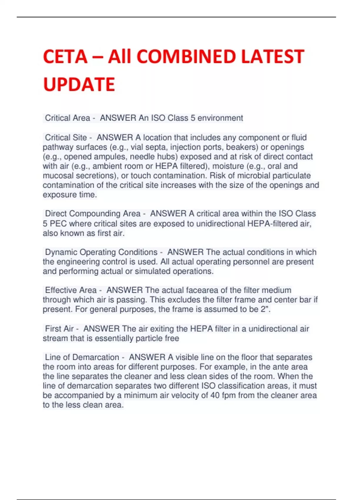 CETA – All COMBINED LATEST UPDATE Critical Area - ANSWER An ISO Class 5 environment Critical Site - ANSWER A location that includes any component or fluid pathway surfaces (e.g., vial septa, injection ports, beakers) or openings (e.g., opened ampules, needle hubs) exposed and at risk of direct contact with air (e.g., ambient room or HEPA filtered), moisture (e.g., oral and mucosal secretions), or touch contamination. Risk of microbial particulate contamination of the critical site increases with the size of the openings and exposure time. Direct Compounding Area - ANSWER A critical area within the ISO Class 5 PEC where critical sites are exposed to unidirectional HEPA-filtered air, also known as first air. Dynamic Operating Conditions - ANSWER The actual conditions in which the engineering control is used. All actual operating personnel are present and performing actual or simulated operations. Effective Area - ANSWER The actual facearea of the filter medium through which air is passing. This excludes the filter frame and center bar if present. For general purposes, the frame is assumed to be 2". First Air - ANSWER The air exiting the HEPA filter in a unidirectional air stream that is essentially particle free Line of Demarcation - ANSWER A visible line on the floor that separates the room into areas for different purposes. For example, in the ante area the line separates the cleaner and less clean sides of the room. When the line of demarcation separates two different ISO classification areas, it must be accompanied by a minimum air velocity of 40 fpm from the cleaner area to the less clean area. Gowning Line - ANSWER A line of demarcation on the floor used to identify where the booties are donned in the gowning process. When this line does not identify a demarcation between ISO Classes it does not require airflow displacement of 40 FPM. Primary Engineering Control - ANSWER A device or room that provides a unidirectional airflow ISO Class 5 environment for the exposure of critical sites when compounding CSPs. Such devices include, but may not be limited to LAFWs, BSCs, CAIs, CACIs, and built in VLFs. Segregated Compounding Area - ANSWER A designated space, either a demarcated area or room, that is restricted to preparing low-risk level, nonhazardous CSPs with 12-hour or less BUD. Such area shall contain a device that provides unidirectional airflow of ISO Class 5 air quality for preparation of CSPs and shall be void of activities and materials that are extraneous to sterile compounding. Secondary Engineering Control - ANSWER The room or suite of rooms used to support sterile compounding operations. Primary engineering controls are placed inside secondary engineering controls. Secondary engineering controls include: ante areas, buffer areas, and segregated compounding areas. State of Control - ANSWER the practice of controlling variables to achieve the expected results. For the purposes of sterile compounding facility certification, a ____ is achieved when critical parameters used to achieve an appropriate environment for sterile compounding are managed and under control. Adequate HEPA filtered air is supplied to the room or PEC and the cleaner space is protected from less clean spaces by overpressure or displacement airflow. Unidirectional Airflow - ANSWER Controlled airflow from the entrance plane of the work zone that makes a single pass along generally parallel streamlines to the exit plane of the work zone with minimal turbulence, without back-flow, refluxing, and/or re-entrainment and at a velocity sufficient to sweep particles away from critical areas. Air is generally delivered to the work area through a HEPA or ULPA filter system or a diffuser that encompasses the entire entrance plane of the work zone
