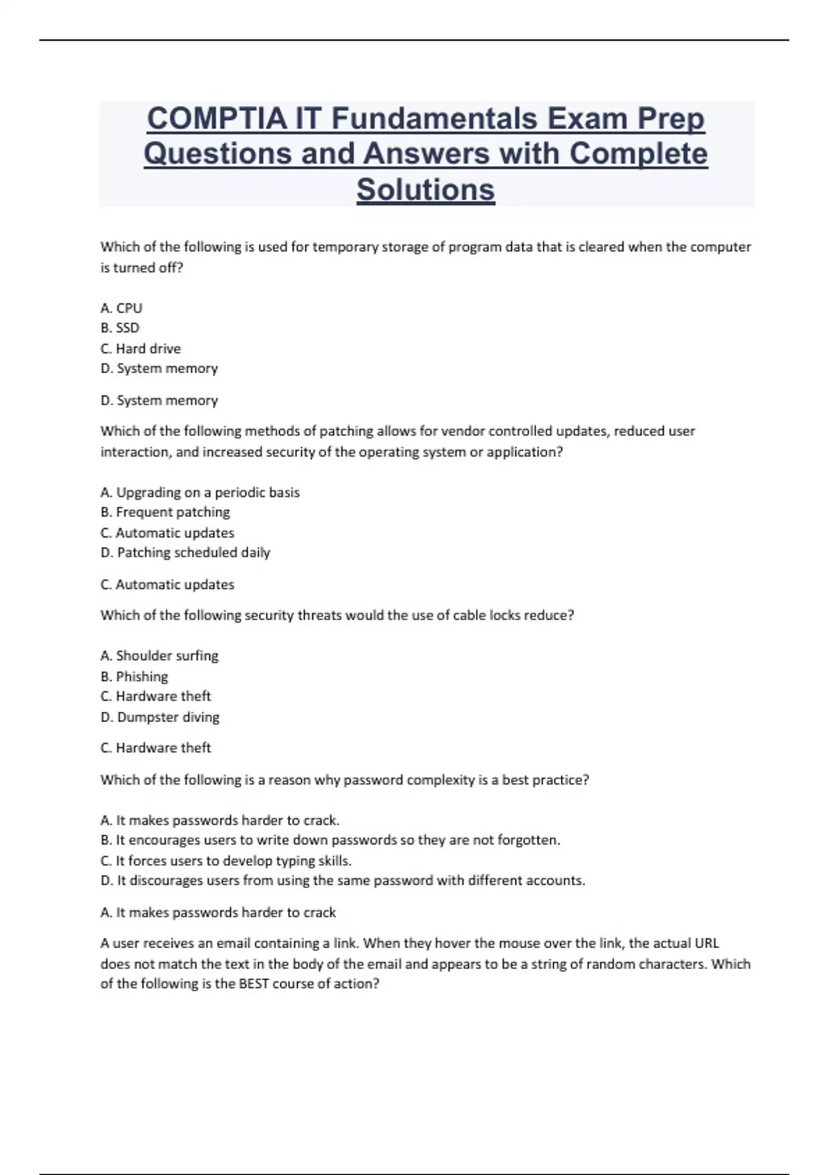 COMPTIA IT Fundamentals Exam Prep Questions and Answers with Complete Solutions