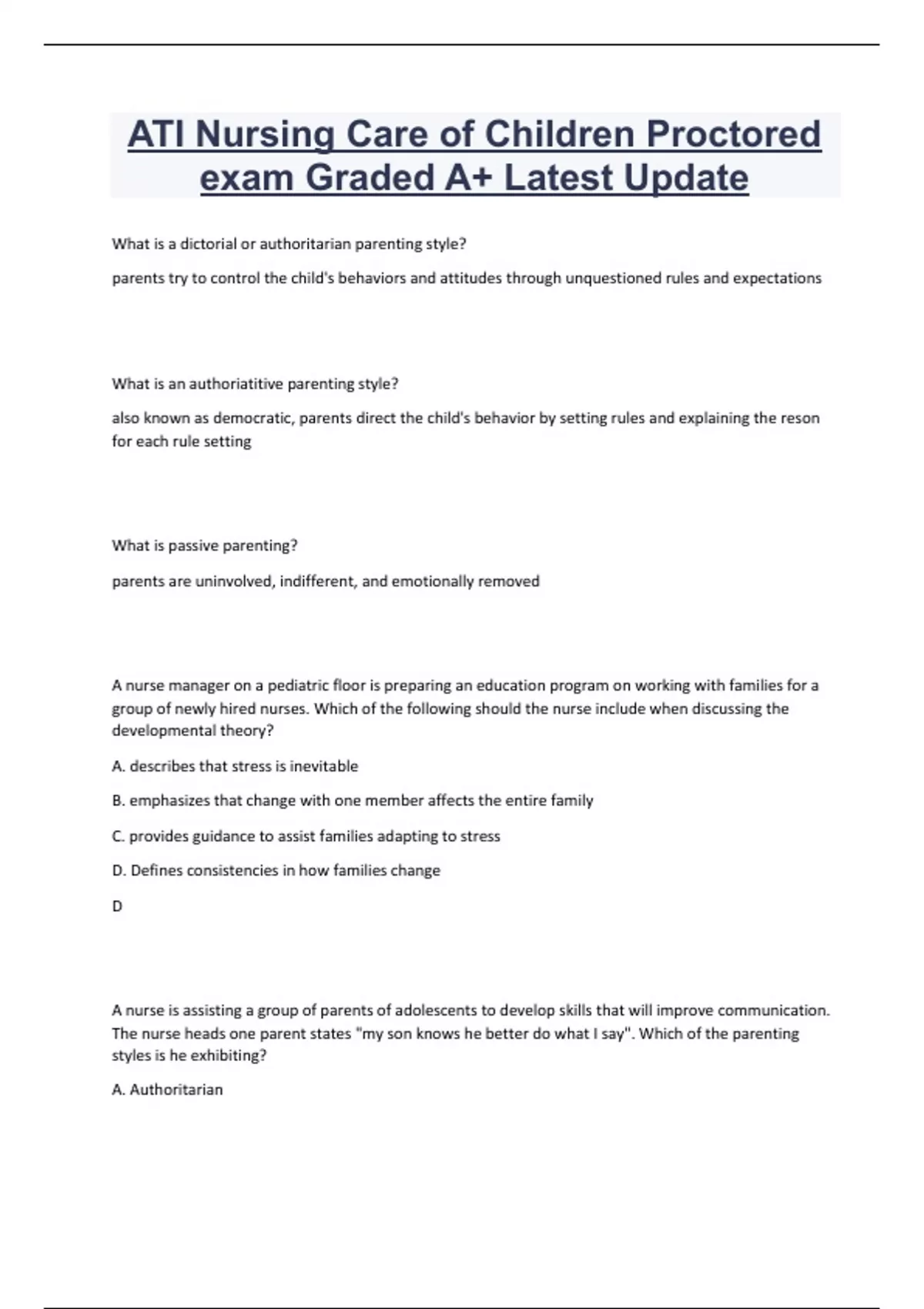 ati nursing care of children proctored exam graded