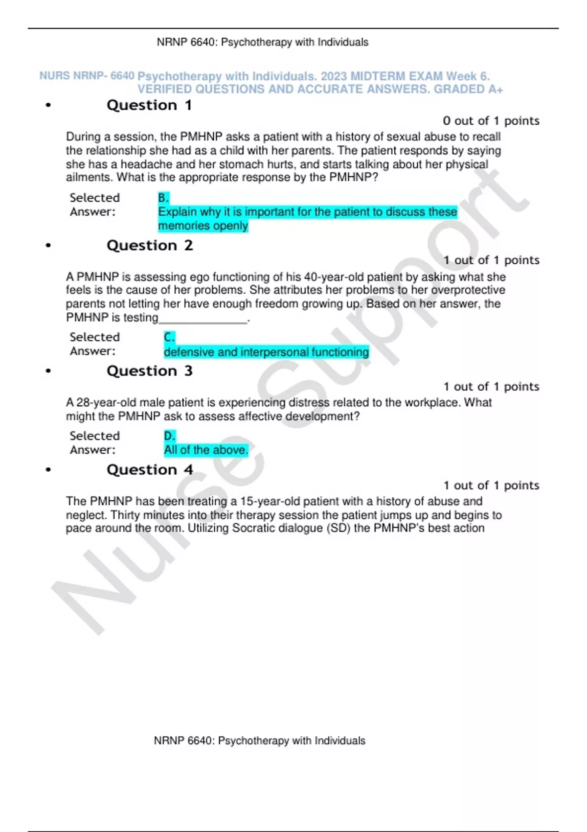 NRNP- 6640 Psychotherapy with Individuals. 2023 MIDTERM EXAM Week 6. GRADED A+