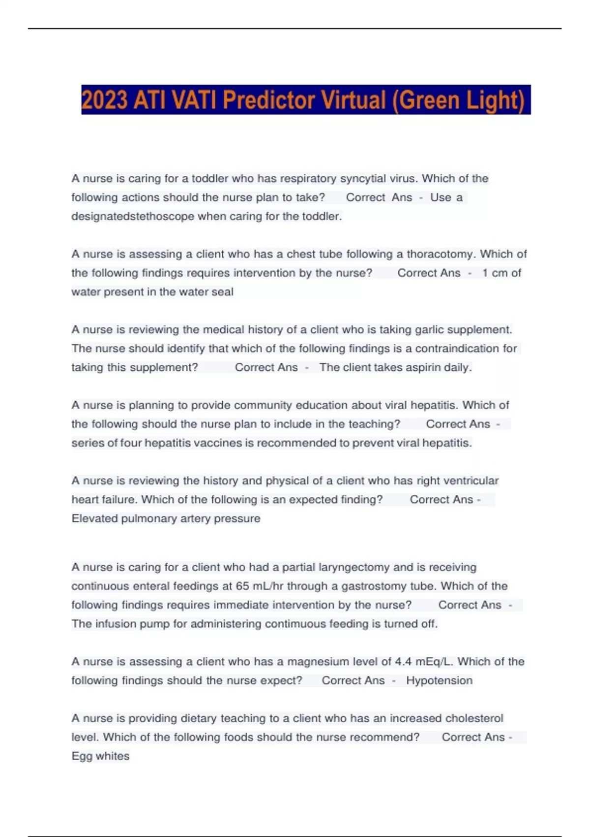 2023 ATI VATI Predictor Virtual (Green Light) A nurse is caring for a toddler who has respiratory syncytial virus. Which of the following actions should the nurse plan to take? Correct Ans - Use a designatedstethoscope when caring for the toddler. A nurse is assessing a client who has a chest tube following a thoracotomy. Which of the following findings requires intervention by the nurse? Correct Ans - 1 cm of water present in the water seal A nurse is reviewing the medical history of a client who is taking garlic supplement. The nurse should identify that which of the following findings is a contraindication for taking this supplement? Correct Ans - The client takes aspirin daily. A nurse is planning to provide community education about viral hepatitis. Which of the following should the nurse plan to include in the teaching? Correct Ans - series of four hepatitis vaccines is recommended to prevent viral hepatitis. A nurse is reviewing the history and physical of a client who has right ventricular heart failure. Which of the following is an expected finding? Correct Ans - Elevated pulmonary artery pressure A nurse is caring for a client who had a partial laryngectomy and is receiving continuous enteral feedings at 65 mL/hr through a gastrostomy tube. Which of the following findings requires immediate intervention by the nurse? Correct Ans - The infusion pump for administering contimuous feeding is turned off. A nurse is assessing a client who has a magnesium level of 4.4 mEq/L. Which of the following findings should the nurse expect? Correct Ans - Hypotension A nurse is providing dietary teaching to a client who has an increased cholesterol level. Which of the following foods should the nurse recommend? Correct Ans - Egg whites A home health nurse is conducting an initial home visit for a client who has terminal breast cancer. The client has two school-age children and a limited support system. Which of the following is the priority nursing action? Correct Ans - Inform the client of available community resources. A nurse is providing postoperative teaching to a client who has a newly-inserted pacemaker. Which of the following statements by the client indicates that the teaching has been effective? Correct Ans - "I will use my cell phone on the ear opposite of my pacemaker." A nurse is caring for a client who has heart failure and has started taking a loop diuretic. Which of the following findings indicates the client is experiencing an adverse effect of the medication? Correct Ans - Decreased reflexes A nurse is caring for a client who has neutropenia due to HIV. Which of the following precautions should the nurse take while caring for this client? Correct Ans - Wearan N95 respirator. A nurse manager is presenting information to the nursing staf f regarding the appropriate use of client restraints. Which of the following should the nurse include? (Select all that apply.) Correct Ans - The nurse should pad the bony prominences. The nurse should remove the restraints every 2 hr. The provider's prescription should include the A nurse is providing discharge teaching about disease prevention to a client who has active tuberculosis. Which of the following should the nurse include? Correct Ans - Educating the client how to cover nose and mouth with tissues when coughing A nurse is caring for a client who reports difficulty falling asleep at night. Which of the following actions should the nurse take? Correct Ans - Schedule routine care tasks during hours when the client is awake. A nurse is preparing a client for surgery and has just administered the preoperative injection. Which of the following actions should the nurse take? Correct Ans - Review deep breathing and coughing exercises. A nurse suspects another nurse is chemically impaired during their shift. Which of the following is an appropriate action for the nurse to take? Correct Ans - Report to the nurse manager. A nurse in the recovery room is assessing a client who has a new chest tube. The nurse finds that the water seal is no longer tidaling. The nurse should identify the finding as resulting from which of the following? Correct Ans - The tubing may be kinked. A nurse delegates tasks to a licensed practical nurse (LPN) and an assistive personnel (AP). When admitting a client who is experiencing acute liver failure and who has ascites and an NG tube, which of the following tasks is most appropriate for the nurse to delegate to the LPN? Correct Ans - Measure the amount of gastric drainage every 2 hr. A nurse is assessing an adult male client who has a BMI of 20. The nurse should identify that the client's BMI falls within which of the following categories? Correct Ans - Healthy weight A nurse is assessing a client who has a long arm cast. For which of the following findings should the nurse monitor when assessing for acute compartment syndrome? Correct Ans - Change in mental status A nurse is planning care for a newly admitted client. Which of the following interventions should the nurse plan to take first? (Click on the "Exhibit" button for additional information about the client. There are three tabs that contain separate categories of data.) Correct Ans - Administer pain medication to the client. A community health nurse is performing a vision screening on a 4-month-old infant. When shining a light source into the infant's visual field, which of the following is an expected finding? Correct Ans - The infant closes their eyes. A nurse is planning discharge teaching for a client who is scheduled to receive intravenous infusions at home. Which of the following instructions should the nurse plan to include? Correct Ans - Place the infusion pump cord against the baseboards. A nurse is caring for a client who has just returned to the unit following a bronchoscopy. Which of the following actions by the assistive personnel requires the nurse to intervene? Correct Ans - Offers oral fluids to the client A nurse is assessing an infant who has 