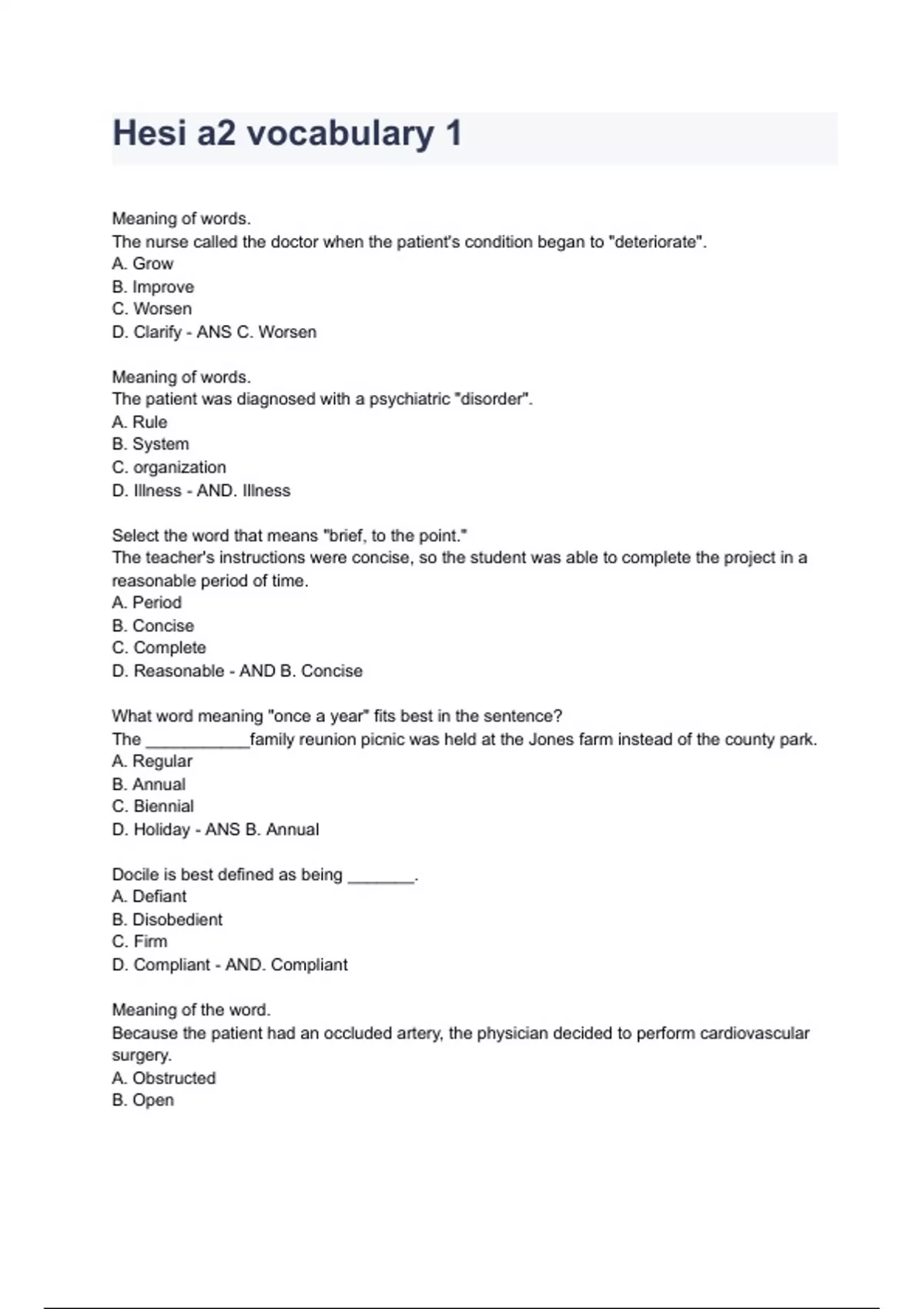 Hesi a2 vocabulary 12023/2024 Questions & Answers.