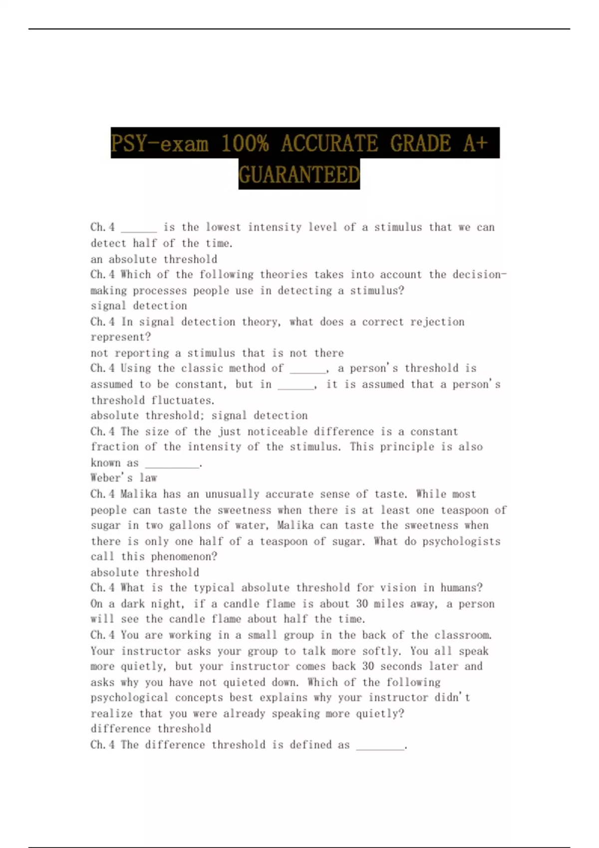Ch.4 ______ is the lowest intensity level of a stimulus that we can detect half of the time. an absolute threshold Ch.4 Which of the following theories takes into account the decision-making processes people use in detecting a stimulus? signal detection Ch.4 In signal detection theory, what does a correct rejection represent? not reporting a stimulus that is not there Ch.4 Using the classic method of ______, a person's threshold is assumed to be constant, but in ______, it is assumed that a person's threshold fluctuates. absolute threshold; signal detection Ch.4 The size of the just noticeable difference is a constant fraction of the intensity of the stimulus. This principle is also known as _________. Weber's law Ch.4 Malika has an unusually accurate sense of taste. While most people can taste the sweetness when there is at least one teaspoon of sugar in two gallons of water, Malika can taste the sweetness when there is only one half of a teaspoon of sugar. What do psychologists call this phenomenon? absolute threshold Ch.4 What is the typical absolute threshold for vision in humans? On a dark night, if a candle flame is about 30 miles away, a person will see the candle flame about half the time. Ch.4 You are working in a small group in the back of the classroom. Your instructor asks your group to talk more softly. You all speak more quietly, but your instructor comes back 30 seconds later and asks why you have not quieted down. Which of the following psychological concepts best explains why your instructor didn't realize that you were already speaking more quietly? difference threshold Ch.4 The difference threshold is defined as ________. the smallest amount of change between two stimuli that you can detect half the time Ch.4 The minimum amount of stimulation required to tell the difference between two stimuli is called the ________. difference threshold Ch.4 According to Weber's law, you are more likely to detect a difference in sound between ________. 2 and 4 decibels Ch.4 Julia is holding a basket of apples that weighs five pounds. Sammy keeps adding more apples to Julia's basket and asks her to tell him when she notices that the basket is heavier. Julia notices a difference when the basket's weight reaches six pounds. Now Julia is holding a basket of apples weighing ten pounds. According to Weber's law, how much additional weight in apples must be added for Julia to notice a difference? 2 pounds Ch.4 Based on what you have learned about Weber's law and just noticeable differences ________. it is easier to detect changes in stimulus intensity when the intensities are low Ch.4 Tammy wants to attend a concert of her favorite duo, Queen Tunius and the Jake-man. Unfortunately, she does not have a ticket. She has decided to sneak into the concert but is worried she might get caught because a security guard is sitting in the concert hall watching for trespassers. According to Weber's law, ________. Tammy should wait until most of the audience is in the concert hall before she sneaks in Ch.4 As the prosthetic detects stimulus information in the environment, the sensation is transmitted to the brain via ________. afferent nerves Ch.4 Igor Spetic is a patient who has used the new prosthetic. He says that with the prosthetic he is now able to feel textures such as cotton balls and sandpaper again. The ability of Igor's brain to tell the difference between textures is known as a(n) ________. perception Ch.4 Which of the following statements is TRUE? This new prosthetic arm provides more natural sensation than earlier devices Ch.4 Bottom-up processing ________. starts with recognizing the smaller pieces and builds up to the whole Ch.4 In perception, bottom-up processing focuses on ______, while top-down processing focuses on ______. what the stimulus is; the function or meaning of the stimulus Ch.4 You are looking at a painting in a museum. You perceive a house in the corner of the painting, although you cannot actually see the entire house because the edge of the frame is blocking part of the image. The fact that you know that what you are seeing is "a house," even though you can only see some parts of it, is due to ________. top-down processing Ch.4 ______ processing is when we use higher level thinking, experience, and expectations to help guide our perception of what is happening. Top-down Ch.4 Which one of the following examples demonstrates bottom-up processing? You viewed an ambiguous stimulus. Although you could not see the whole picture, you could still tell it was a dog. Ch.4 You are having fun joking around with the new boy in your school. There are some other students talking not too far away, but you don't even realize they are there until you hear one of them say your name. This is an example of ________. selective attention Ch.4 Attention is defined as ________. the limited capacity to process information under our conscious control Ch.4 You have been writing that dreaded term paper all night. It's 3am and you are very tired. You finally decide to quit and go to bed after you find yourself reading the same paragraph over and over. In this example, you have lost the ability to use which kind of attention? sustained attention Ch.4 Which of the following scenarios is the best example of multitasking? Fran is eating popcorn while watching a movie. Ch.4 Light enters the interior of the eye through the ________. pupil Ch.4 Which of the photoreceptors is responsible for color vision and is most functional in conditions of bright light? cones Ch.4 Humans are trichromatic. To what three colors are our eyes sensitive? red, green, and blue Ch.4 Meg had neurosurgery to remove a tumor. After the surgery, she could no longer see. Which of the following structures was most likely severed during the surgery? thalamus CONTINUED.....