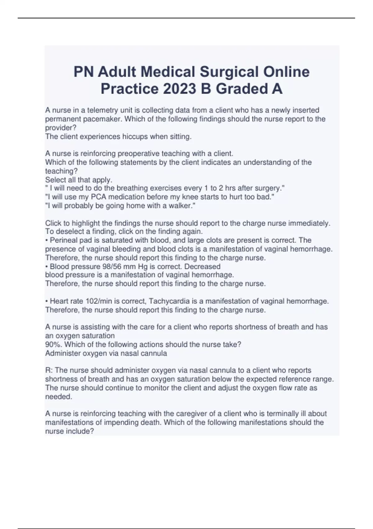 A nurse in a telemetry unit is collecting data from a client who has a newly inserted permanent pacemaker. Which of the following findings should the nurse report to the provider? The client experiences hiccups when sitting. A nurse is reinforcing preoperative teaching with a client. Which of the following statements by the client indicates an understanding of the teaching? Select all that apply. " I will need to do the breathing exercises every 1 to 2 hrs after surgery." "I will use my PCA medication before my knee starts to hurt too bad." "I will probably be going home with a walker." Click to highlight the findings the nurse should report to the charge nurse immediately. To deselect a finding, click on the finding again. • Perineal pad is saturated with blood, and large clots are present is correct. The presence of vaginal bleeding and blood clots is a manifestation of vaginal hemorrhage. Therefore, the nurse should report this finding to the charge nurse. • Blood pressure 98/56 mm Hg is correct. Decreased blood pressure is a manifestation of vaginal hemorrhage. Therefore, the nurse should report this finding to the charge nurse. • Heart rate 102/min is correct, Tachycardia is a manifestation of vaginal hemorrhage. Therefore, the nurse should report this finding to the charge nurse. A nurse is assisting with the care for a client who reports shortness of breath and has an oxygen saturation 90%. Which of the following actions should the nurse take? Administer oxygen via nasal cannula R: The nurse should administer oxygen via nasal cannula to a client who reports shortness of breath and has an oxygen saturation below the expected reference range. The nurse should continue to monitor the client and adjust the oxygen flow rate as needed. A nurse is reinforcing teaching with the caregiver of a client who is terminally ill about manifestations of impending death. Which of the following manifestations should the nurse include? Incontinence of the bowel and bladder. Rationale:The nurse should inform the caregiver that incontinence of the bowel and bladder is a manifestation of impending death. Other manifestations include hypotension, bradycardia, restlessness, and coolness of the skin. A nurse in a clinic is collecting data from a client who has hyperthyroidism and has been taking methimazole for 4 weeks. Which of the following statements by the client indicates a therapeutic response to the medication? "I have gained 3 lbs since my last appointment" R: Hyperthyroidism can cause weight loss. Therefore, the nurse should identify weight gain as an indication that the methimazole therapy has been effective A nurse is contributing to the plan of care for a client who is postoperative following a total knee arthroplasty. The client is using a continuous passive motion (CPM) machine. Which of the following interventions should the nurse recommend for the plan of care? Keep a sheepskin pad between the client's extremity and the CPM machine. R: The nurse should plan to keep a sheepskin pad between the dient's extremity and the cOM madhune to protect the client's skin. The nurse should check the client's skin condition frequendy wile the cient is using the CPM machine. A nurse is reinforcing teaching with a client about testicular self-examination. Which of the following instructions should the nurse include in the teaching? "Perform testicular self-examination after taking a warm shower." Rationale: The nurse should instruct the client to perform testicular self-examination after taking a warm shower or bath. This causes relaxation of the scrotal skin, which allows for better palpation of the testes. A nurse is reinforcing discharge teaching for the caregivers of a client who has Parkinson's disease. Which of the following information should the nurse include in the teaching? Remind the client to avoid watching their feet when walking. R: The nurse should remind the client's caregivers to frequently remind the client to maintain correct posture and prevent falls by not watching their feet when walking. A home health nurse is assisting with the care for a client who has COPD. The client reports shortness of breath while eating, despite the use of home oxygen. Which of the following recommendations should the nurse make? "Use a bronchodilator 30 minutes before your meal."