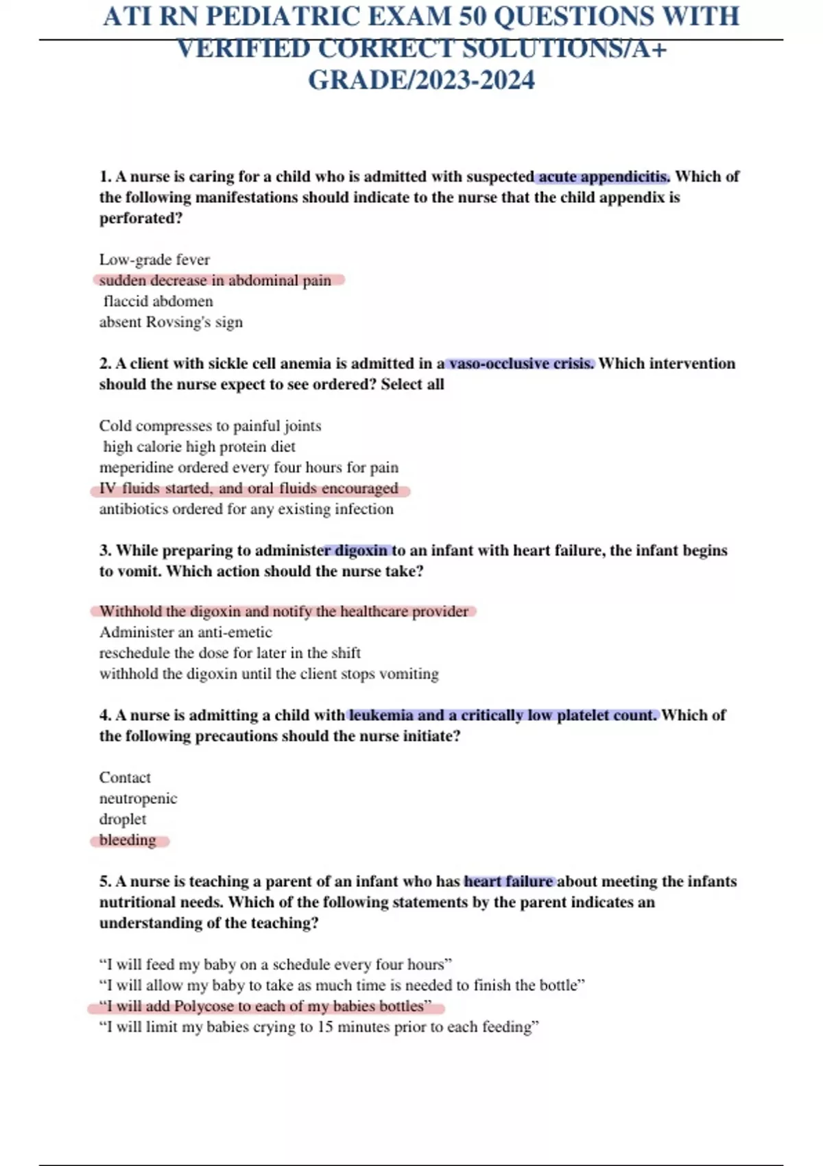ATI RN PEDIATRIC EXAM 50 QUESTIONS WITH VERIFIED CORRECT SOLUTIONS/A+ GRADE/ 1. A nurse is caring for a child who is admitted with suspected acute appendicitis. Which of the following manifestations should indicate to the nurse that the child appendix is perforated? Low-grade fever sudden decrease in abdominal pain flaccid abdomen absent Rovsing's sign 2. A client with sickle cell anemia is admitted in a vaso-occlusive crisis. Which intervention should the nurse expect to see ordered? Select all Cold compresses to painful joints high calorie high protein diet meperidine ordered every four hours for pain IV fluids started, and oral fluids encouraged antibiotics ordered for any existing infection 3. While preparing to administer digoxin to an infant with heart failure, the infant begins to vomit. Which action should the nurse take? Withhold the digoxin and notify the healthcare provider Administer an anti-emetic reschedule the dose for later in the shift withhold the digoxin until the client stops vomiting 4. A nurse is admitting a child with leukemia and a critically low platelet count. Which of the following precautions should the nurse initiate? Contact neutropenic droplet bleeding 5. A nurse is teaching a parent of an infant who has heart failure about meeting the infants nutritional needs. Which of the following statements by the parent indicates an understanding of the teaching? “I will feed my baby on a schedule every four hours” “I will allow my baby to take as much time is needed to finish the bottle” “I will add Polycose to each of my babies bottles” “I will limit my babies crying to 15 minutes prior to each feeding” ATI RN PEDIATRIC EXAM 50 QUESTIONS WITH VERIFIED CORRECT SOLUTIONS/A+ GRADE/ 6. A nurse is providing discharge instructions to the parent of a 10-year-old child following a cardiac Cath. Which of the following instructions should the nurse include? Give the child acetaminophen for discomfort Keep the child home for one week Assist the child to take a tub bath for the first three days Offer the child clear liquids for the first 24 hrs 7. A nurse is planning care for a 10 month old infant that is 8 hours postoperative following cleft pallet repair. Which of the following interventions should the nurse include in the infant plan of care? Apply and release elbow restraints every hour feed the infant with a spoon for 48 hours keep the infant supine suction the mouth with an oral suction tube 8. A nurse is caring for an infant with a palpable mass in the upper right quadrant and stools mixed with blood and mucus. The nurse should recognize that which of the following is associated with these findings? Tracheoesophageal fistula inguinal hernia hypertrophic pyloric stenosis intussusception 9. A nurse is providing instructions to a parent of a child with Hirschsprung disease is scheduled for initial surgery. Which of the following statements by the parent indicates an understanding of the information. I'm glad my child will have normal bowel movements now I want to learn how to use my child feeding tube as soon as possible I want to learn how to empty my child urinary catheter bag I'm glad that my child's stony is only temporary 10. A nurse is admitting a six month old infant with dehydration. Which of the following amounts of urinary output should indicate to the nurse that treatment has corrected the fluid imbalance? 2 mL/kg/hour 15 mL/kg/hr 7.5 mL/kg/hr 0.5 mL/kg/hr ATI RN PEDIATRIC EXAM 50 QUESTIONS WITH VERIFIED CORRECT SOLUTIONS/A+ GRADE/ 11. The nurse is preparing to administer a unit of red blood cells to a pediatric client diagnosed with severe anemia. How should the nurse respond when the clients parent asks what benefit of the transfusion will have? The additional RBC can increase energy levels so your child is not as tired The additional RBCs will help your child's blood clots efficiently The additional RBCs will allow the heart to body to pump more efficiently The additional RBCs will help prevent your child fight off infection 12. A nurse is instructing a parent of an infant with heart failure about meeting the infants nutritional needs. Which of the following statements by the parent indicates an understanding of the instructions? (REPEAT of Q5) I will add Polycose to each of my babies bottles I will feed my baby on a schedule every four hours I will allow my baby to take as much time is needed to finish the bottle I will limit my babies crying to 15 minutes prior to each feeding. 13. A nurse is assessing a toddler who has a cute nephrotic syndrome. Which of the following findings should the nurse report to the provider? Facial edema Yellow nasal discharge Poor appetite Irritability 14. A nurse is assessing a child who is in sickle cell crisis. Which of the following findings should the nurse expect? Constipation Pain High fever Badycardia 15. The nurse is providing instructions to a parent of a child with celiac disease. The nurse should indicate which of the following food choices for this child? Wheat Barley Rye Rice