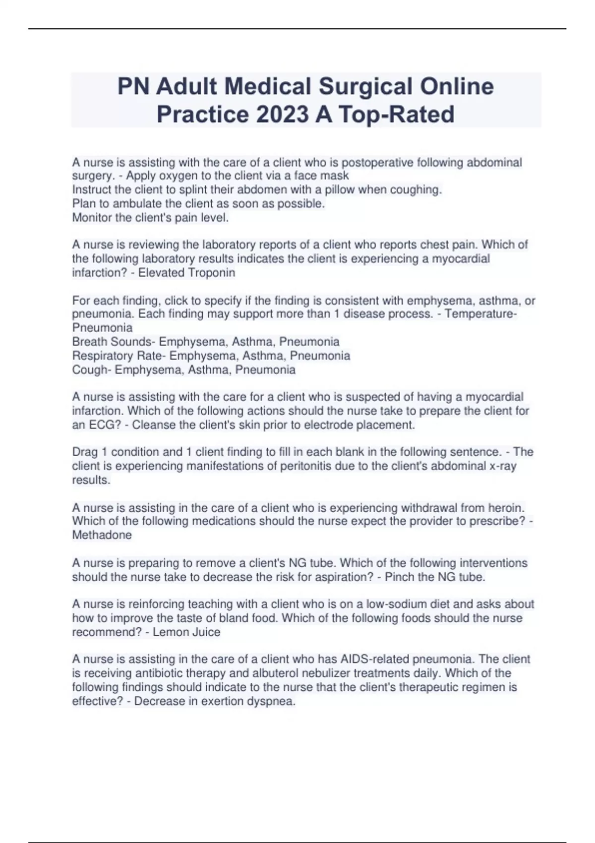 A nurse is assisting with the care of a client who is postoperative following abdominal surgery. - Apply oxygen to the client via a face mask Instruct the client to splint their abdomen with a pillow when coughing. Plan to ambulate the client as soon as possible. Monitor the client's pain level. A nurse is reviewing the laboratory reports of a client who reports chest pain. Which of the following laboratory results indicates the client is experiencing a myocardial infarction? - Elevated Troponin For each finding, click to specify if the finding is consistent with emphysema, asthma, or pneumonia. Each finding may support more than 1 disease process. - Temperature- Pneumonia Breath Sounds- Emphysema, Asthma, Pneumonia Respiratory Rate- Emphysema, Asthma, Pneumonia Cough- Emphysema, Asthma, Pneumonia A nurse is assisting with the care for a client who is suspected of having a myocardial infarction. Which of the following actions should the nurse take to prepare the client for an ECG? - Cleanse the client's skin prior to electrode placement. Drag 1 condition and 1 client finding to fill in each blank in the following sentence. - The client is experiencing manifestations of peritonitis due to the client's abdominal x-ray results. A nurse is assisting in the care of a client who is experiencing withdrawal from heroin. Which of the following medications should the nurse expect the provider to prescribe? - Methadone A nurse is preparing to remove a client's NG tube. Which of the following interventions should the nurse take to decrease the risk for aspiration? - Pinch the NG tube. A nurse is reinforcing teaching with a client who is on a low-sodium diet and asks about how to improve the taste of bland food. Which of the following foods should the nurse recommend? - Lemon Juice A nurse is assisting in the care of a client who has AIDS-related pneumonia. The client is receiving antibiotic therapy and albuterol nebulizer treatments daily. Which of the following findings should indicate to the nurse that the client's therapeutic regimen is effective? - Decrease in exertion dyspnea. A nurse is assisting with the care for a client who is postoperative and has an epidural infusion. Which of the following findings should the nurse recognize as the priority? - Dyspnea A nurse is providing information regarding transmission-based precautions for a client who has Clostridium Difficile to an assistive personnel (AP). Which of the following instructions should the nurse include? (Select all that apply.) - "Provide the client with disposable utensils and dishes for meals." "Leave blood pressure equipment in the client's room" "Clean contaminated surfaces with a bleach solution" A nurse is contributing to the plan of care for a client who has just transferred to the medical-surgical unit from the PACU following a right total knee arthroplasty. Which of the following interventions should the nurse include in the plan? - Assist the client to change positions at least every 2 hr. A nurse is preparing to administer scheduled medications to the client. Which of the following prescriptions should the nurse verify with the provider? (Click on the exhibit tabs for additional information about the client. There are three tabs that contain separate categories of data.) - Ceftriaxone A nurse is examining a client's IV site and notes a hardened vein above their IV site. The client reports a throbbing, burning pain at the IV site. The nurse should identify that the client's manifestations indicate which of the following complications of IV therapy? - Thrombophlebitis A nurse is reinforcing teaching with a client prior to the removal of a leg cast. Which of the following statements should indicate to the nurse that the client understands the teaching? - "I will feel vibrations on my leg from the cast cutter." A nurse is collecting data from a client and notices several skin lesions. Which of the following findings should the nurse report as possible melanoma? - Irregular borders A nurse is assisting with the care for a client who has difficulty swallowing. Which of the following actions should the nurse implement to prevent aspiration? - Give the client liquids with increased viscosity. A nurse is reinforcing teaching regarding the use of a continuous passive motion (CPM) machine with a client who is scheduled for a total knee arthroplasty. Which of the following information should the nurse include in the teaching? (Select all that apply.) - "Your knee is flexed and extended as prescribed by your provider." "The machine is padded with sheep skin."
