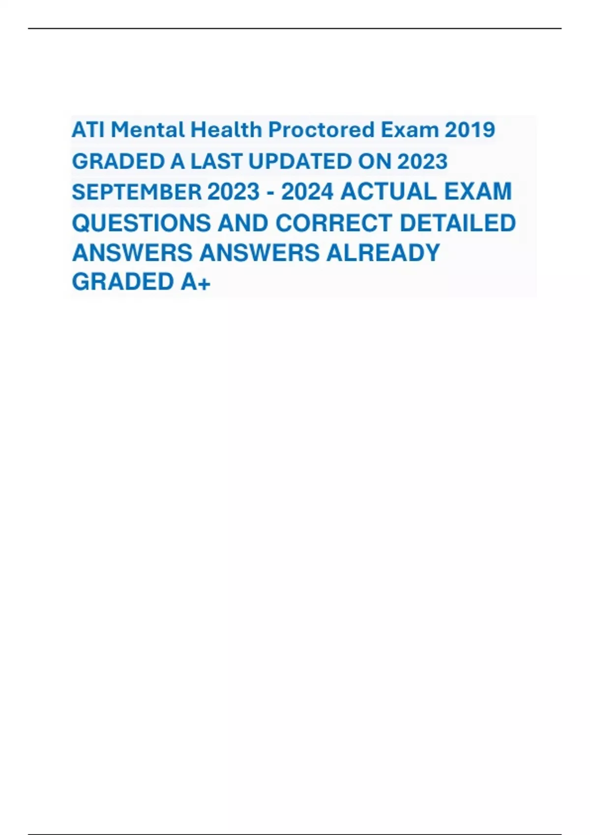 ATI Mental Health Proctored Exam 2019 GRADED A LAST UPDATED ON 2023 SEPTEMBER ACTUAL EXAM QUESTIONS AND CORRECT DETAILED ANSWERS ANSWERS ALREADY GRADED A+