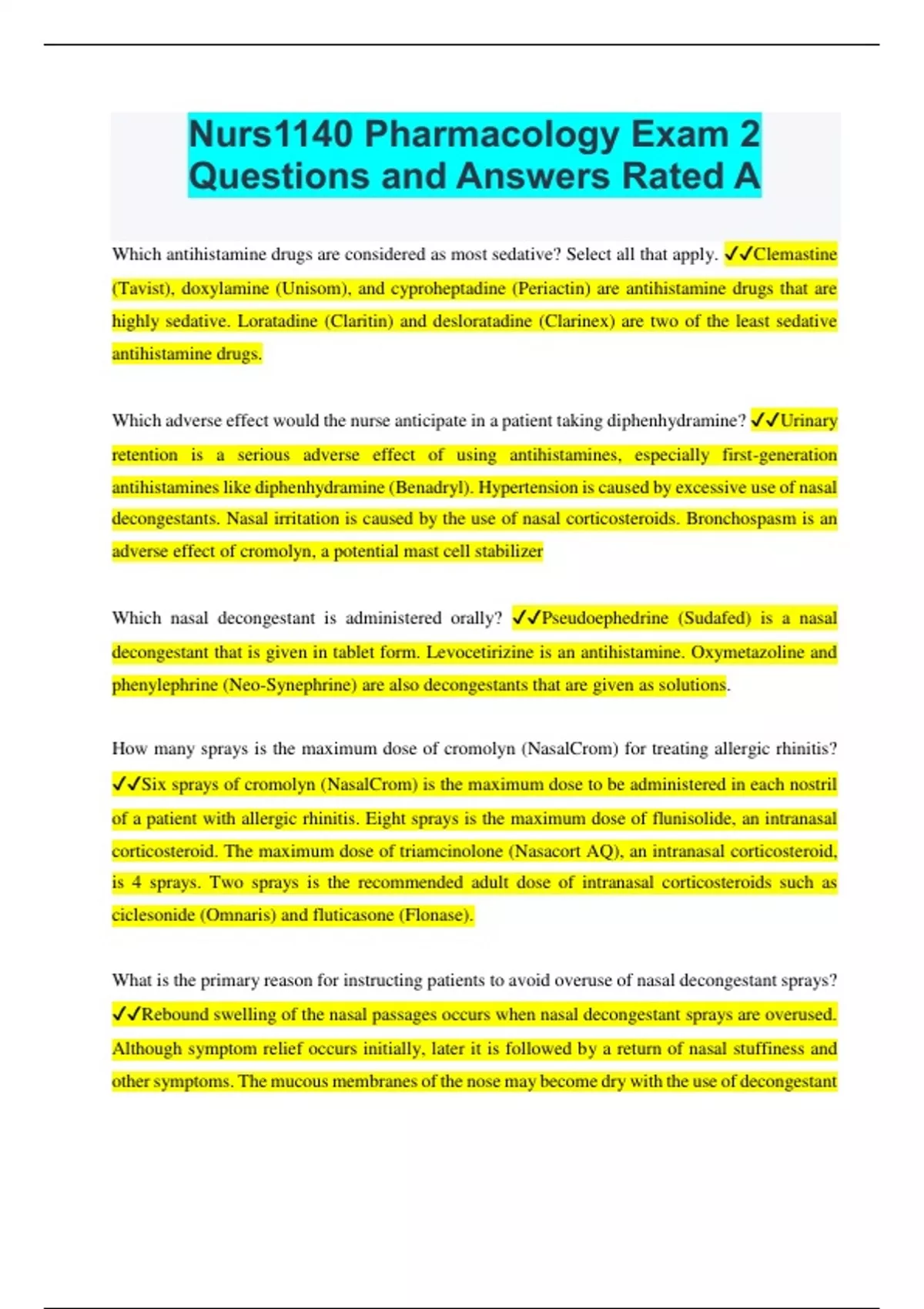 Nurs1140 Pharmacology Exam 2 Questions and Answers Rated A Which antihistamine drugs are considered as most sedative? Select all that apply. Clemastine (Tavist), doxylamine (Unisom), and cyproheptadine (Periactin) are antihistamine drugs that are highly sedative. Loratadine (Claritin) and desloratadine (Clarinex) are two of the least sedative antihistamine drugs. Which adverse effect would the nurse anticipate in a patient taking diphenhydramine? Urinary retention is a serious adverse effect of using antihistamines, especially first-generation antihistamines like diphenhydramine (Benadryl). Hypertension is caused by excessive use of nasal decongestants. Nasal irritation is caused by the use of nasal corticosteroids. Bronchospasm is an adverse effect of cromolyn, a potential mast cell stabilizer Which nasal decongestant is administered orally? Pseudoephedrine (Sudafed) is a nasal decongestant that is given in tablet form. Levocetirizine is an antihistamine. Oxymetazoline and phenylephrine (Neo-Synephrine) are also decongestants that are given as solutions. How many sprays is the maximum dose of cromolyn (NasalCrom) for treating allergic rhinitis? Six sprays of cromolyn (NasalCrom) is the maximum dose to be administered in each nostril of a patient with allergic rhinitis. Eight sprays is the maximum dose of flunisolide, an intranasal corticosteroid. The maximum dose of triamcinolone (Nasacort AQ), an intranasal corticosteroid, is 4 sprays. Two sprays is the recommended adult dose of intranasal corticosteroids such as ciclesonide (Omnaris) and fluticasone (Flonase).
