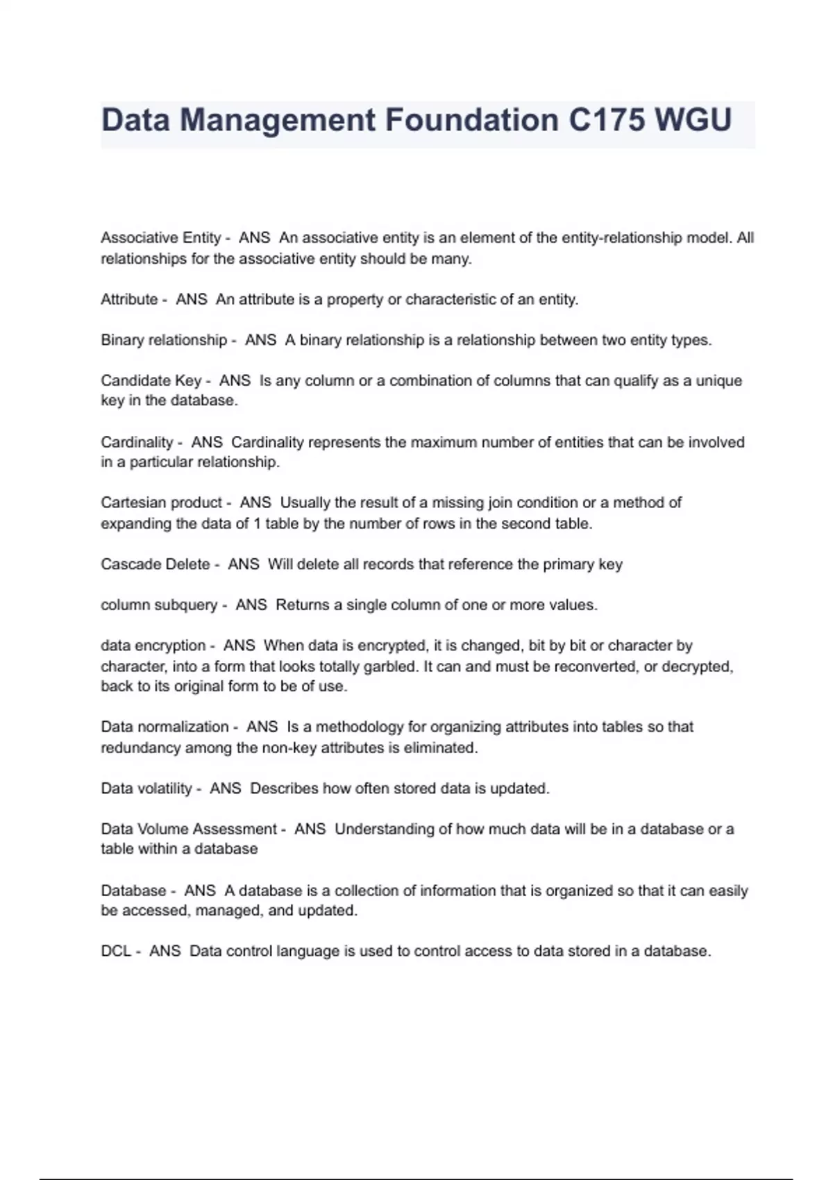 Data Management Foundation C175 WGU Questions And Answers All Verified Associative Entity - ANS An associative entity is an element of the entity-relationship model. All relationships for the associative entity should be many. Attribute - ANS An attribute is a property or characteristic of an entity. Binary relationship - ANS A binary relationship is a relationship between two entity types. Candidate Key - ANS Is any column or a combination of columns that can qualify as a unique key in the database. Cardinality - ANS Cardinality represents the maximum number of entities that can be involved in a particular relationship. Cartesian product - ANS Usually the result of a missing join condition or a method of expanding the data of 1 table by the number of rows in the second table. Cascade Delete - ANS Will delete all records that reference the primary key column subquery - ANS Returns a single column of one or more values. data encryption - ANS When data is encrypted, it is changed, bit by bit or character by character, into a form that looks totally garbled. It can and must be reconverted, or decrypted, back to its original form to be of use. Data normalization - ANS Is a methodology for organizing attributes into tables so that redundancy among the non-key attributes is eliminated. Data volatility - ANS Describes how often stored data is updated. Data Volume Assessment - ANS Understanding of how much data will be in a database or a table within a database Database - ANS A database is a collection of information that is organized so that it can easily be accessed, managed, and updated. DCL - ANS Data control language is used to control access to data stored in a database. DDL - ANS Data definition language - involves instructing the DBMS software on what tables will be in the database, what attributes will be in the tables, which attributes will be indexed, and so forth. Definer - ANS Definer is a MySQL term where AuthID is the same for another DBMS Denormalization - ANS The act of duplicating data in a database for performance or the preservation of historical information disaster recovery - ANS Involves rebuilding an entire information system or significant parts of one after a catastrophic natural disaster such as a hurricane, tornado, earthquake, building collapse, or even a major fire.