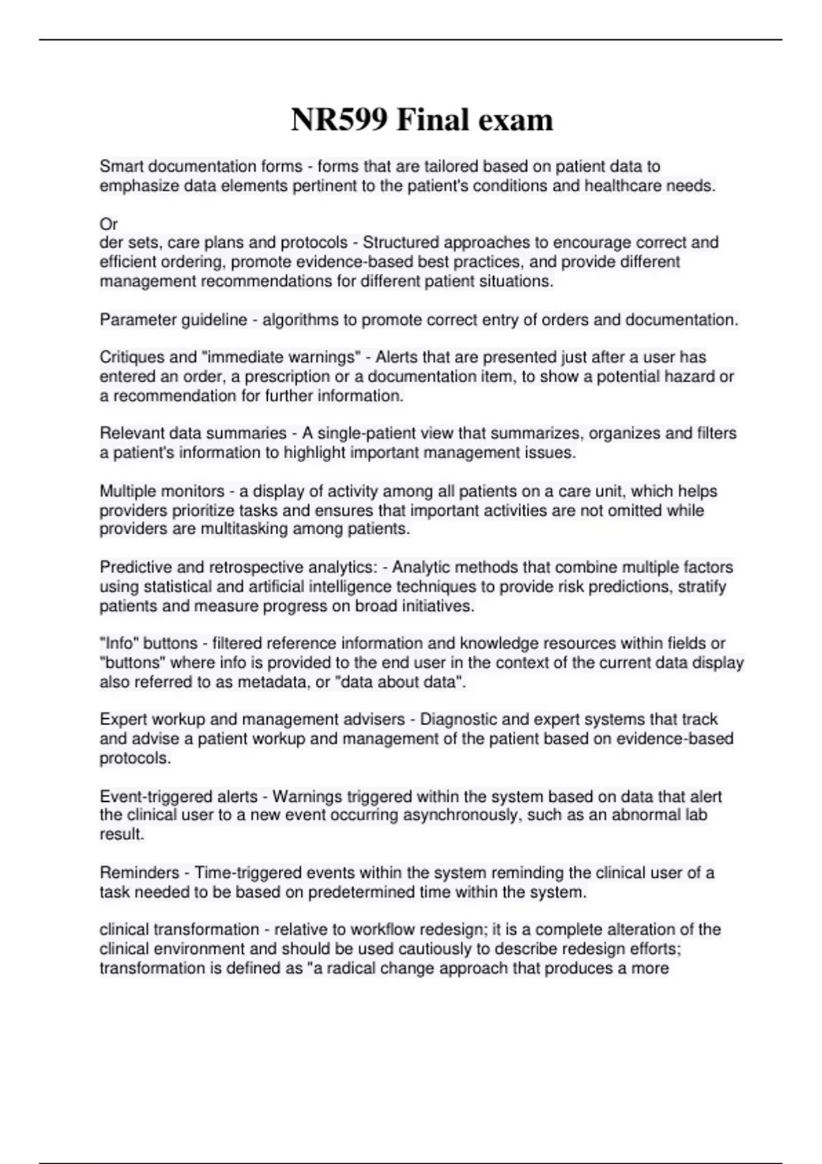 Smart documentation forms - forms that are tailored based on patient data to emphasize data elements pertinent to the patient's conditions and healthcare needs. Or der sets, care plans and protocols - Structured approaches to encourage correct and efficient ordering, promote evidence-based best practices, and provide different management recommendations for different patient situations. Parameter guideline - algorithms to promote correct entry of orders and documentation. Critiques and "immediate warnings" - Alerts that are presented just after a user has entered an order, a prescription or a documentation item, to show a potential hazard or a recommendation for further information. Relevant data summaries - A single-patient view that summarizes, organizes and filters a patient's information to highlight important management issues. Multiple monitors - a display of activity among all patients on a care unit, which helps providers prioritize tasks and ensures that important activities are not omitted while providers are multitasking among patients. Predictive and retrospective analytics: - Analytic methods that combine multiple factors using statistical and artificial intelligence techniques to provide risk predictions, stratify patients and measure progress on broad initiatives. "Info" buttons - filtered reference information and knowledge resources within fields or "buttons" where info is provided to the end user in the context of the current data display also referred to as metadata, or "data about data". Expert workup and management advisers - Diagnostic and expert systems that track and advise a patient workup and management of the patient based on evidence-based protocols. Event-triggered alerts - Warnings triggered within the system based on data that alert the clinical user to a new event occurring asynchronously, such as an abnormal lab result. Reminders - Time-triggered events within the system reminding the clinical user of a task needed to be based on predetermined time within the system. clinical transformation - relative to workflow redesign; it is a complete alteration of the clinical environment and should be used cautiously to describe redesign efforts; transformation is defined as "a radical change approach that produces a more responsive organization that is more capable of performing in unstable and changing environments that organizations continue to be faced with"; - this would imply that the manner in which work is carried out and the outcomes achieved are completely different from the prior state. which is not always true when the change involves implementing technology - technology can be used to launch or in conjunction with a clinical transformation initiative but the implementation of technology alone is not considered transformational. - Optimization - - when workflow analysis occurs post implementation, it is often referred to as ________________ - it is the process of moving conditions past their current states and into more efficient and effective methods of performing tasks. -it is considered to be the act, process, or methodology of making something (as a design, system or decision) as fully perfect, functional, and effective as possible. Process Analysis - breaking down the work process into a sequential series of steps that can be examined and assessed to improve effectiveness and efficiency; explains how work takes place, gets done, or how it can be done. Workflow analysis - observation and documentation of workflow to better understand what is happening in the current environment and how it can be altered is referred to as this process. - it requires careful attention to detail and the ability to moderate group discussions, organize concepts, and generate solutions. - this is part of every functional area the INS engages in. Process Map - a typical output of workflow analysis is a visual depiction of the process called a ______ ________; this provides an excellent tool to identify specific steps in the workflow analysis process. - it also provides a vehicle for communication and a tool upon which to build educational material, procedures and policies. - an example is the swim-lane technique