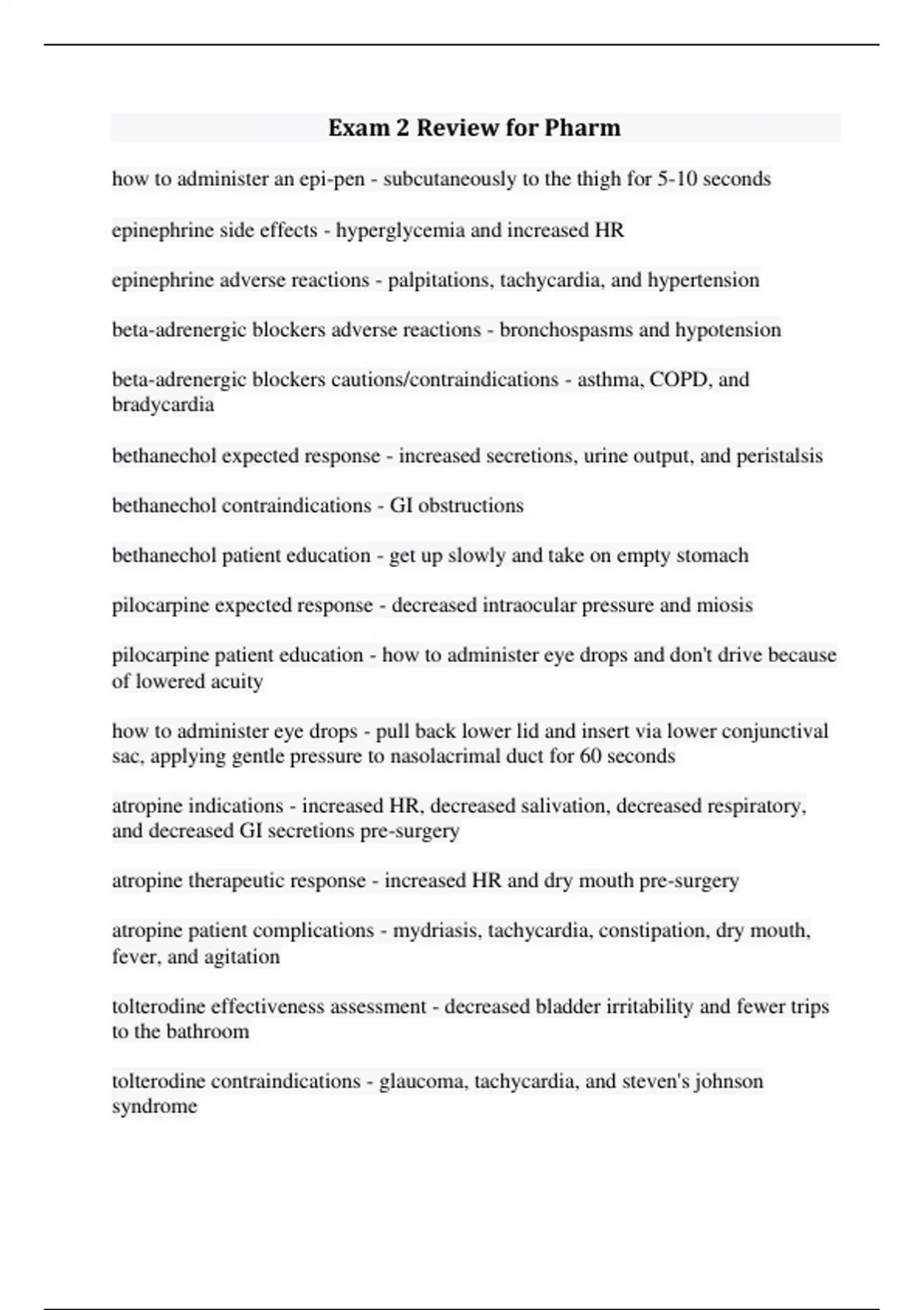 how to administer an epi-pen - subcutaneously to the thigh for 5-10 seconds epinephrine side effects - hyperglycemia and increased HR epinephrine adverse reactions - palpitations, tachycardia, and hypertension beta-adrenergic blockers adverse reactions - bronchospasms and hypotension beta-adrenergic blockers cautions/contraindications - asthma, COPD, and bradycardia bethanechol expected response - increased secretions, urine output, and peristalsis bethanechol contraindications - GI obstructions bethanechol patient education - get up slowly and take on empty stomach pilocarpine expected response - decreased intraocular pressure and miosis pilocarpine patient education - how to administer eye drops and don't drive because of lowered acuity how to administer eye drops - pull back lower lid and insert via lower conjunctival sac, applying gentle pressure to nasolacrimal duct for 60 seconds atropine indications - increased HR, decreased salivation, decreased respiratory, and decreased GI secretions pre-surgery atropine therapeutic response - increased HR and dry mouth pre-surgery atropine patient complications - mydriasis, tachycardia, constipation, dry mouth, fever, and agitation tolterodine effectiveness assessment - decreased bladder irritability and fewer trips to the bathroom tolterodine contraindications - glaucoma, tachycardia, and steven's johnson syndromebenztropine contraindications - glaucoma, tardive dyskinesia, and myasthenia gravis