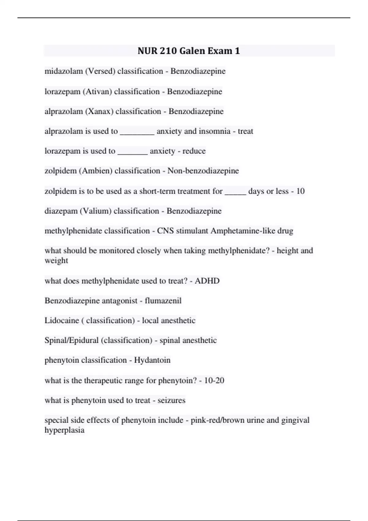 midazolam (Versed) classification - Benzodiazepine lorazepam (Ativan) classification - Benzodiazepine alprazolam (Xanax) classification - Benzodiazepine alprazolam is used to ________ anxiety and insomnia - treat lorazepam is used to _______ anxiety - reduce zolpidem (Ambien) classification - Non-benzodiazepine zolpidem is to be used as a short-term treatment for _____ days or less - 10 diazepam (Valium) classification - Benzodiazepine methylphenidate classification - CNS stimulant Amphetamine-like drug what should be monitored closely when taking methylphenidate? - height and weight what does methylphenidate used to treat? - ADHD Benzodiazepine antagonist - flumazenil Lidocaine ( classification) - local anesthetic Spinal/Epidural (classification) - spinal anesthetic phenytoin classification - Hydantoin what is the therapeutic range for phenytoin? - 10-20 what is phenytoin used to treat - seizures special side effects of phenytoin include - pink-red/brown urine and gingival hyperplasia