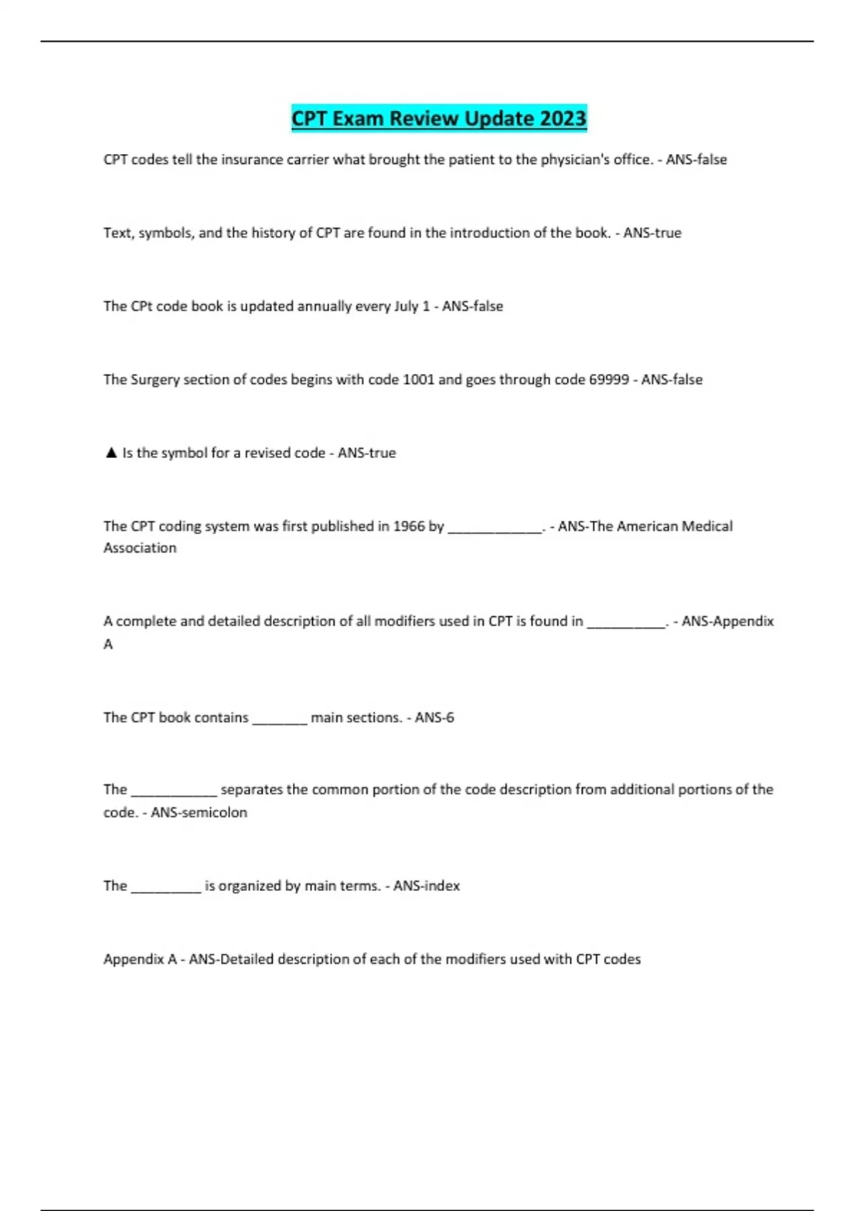 CPT Exam Review Update 2023 CPT codes tell the insurance carrier what brought the patient to the physician's office. - ANS-false Text, symbols, and the history of CPT are found in the introduction of the book. - ANS-true The CPt code book is updated annually every July 1 - ANS-false The Surgery section of codes begins with code 1001 and goes through code 69999 - ANS-false ▲ Is the symbol for a revised code - ANS-true The CPT coding system was first published in 1966 by ____________. - ANS-The American Medical Association A complete and detailed description of all modifiers used in CPT is found in __________. - ANS-Appendix A The CPT book contains _______ main sections. - ANS-6 The ___________ separates the common portion of the code description from additional portions of the code. - ANS- CONTINUES...