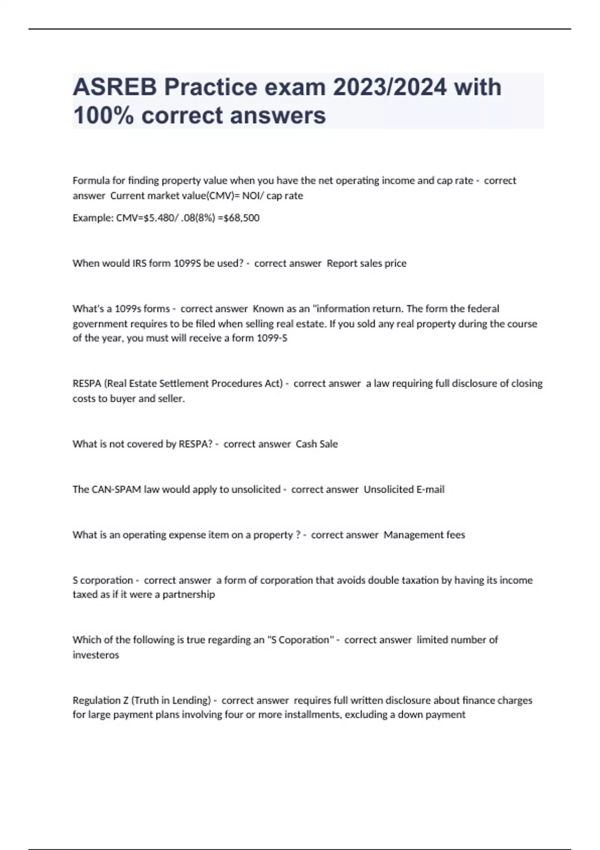 Formula for finding property value when you have the net operating income and cap rate - correct answer Current market value(CMV)= NOI/ cap rate Example: CMV=$5.480/ .08(8%) =$68,500 When would IRS form 1099S be used? - correct answer Report sales price What's a 1099s forms - correct answer Known as an "information return. The form the federal government requires to be filed when selling real estate. If you sold any real property during the course of the year, you must will receive a form 1099-S RESPA (Real Estate Settlement Procedures Act) - correct answer a law requiring full disclosure of closing costs to buyer and seller. What is not covered by RESPA? - correct answer Cash Sale The CAN-SPAM law would apply to unsolicited - correct answer Unsolicited E-mail What is an operating expense item on a property ? - correct answer Management fees S corporation - correct answer a form of corporation that avoids double taxation by having its income taxed as if it were a partnership Which of the following is true regarding an "S Coporation" - correct answer limited number of investeros Regulation Z (Truth in Lending) - correct answer requires full written disclosure about finance charges for large payment plans involving four or more installments, excluding a down payment The books "Settlement costs and You" is a requirement of: - correct answer RESPA. Booklet heralds from RESPA
