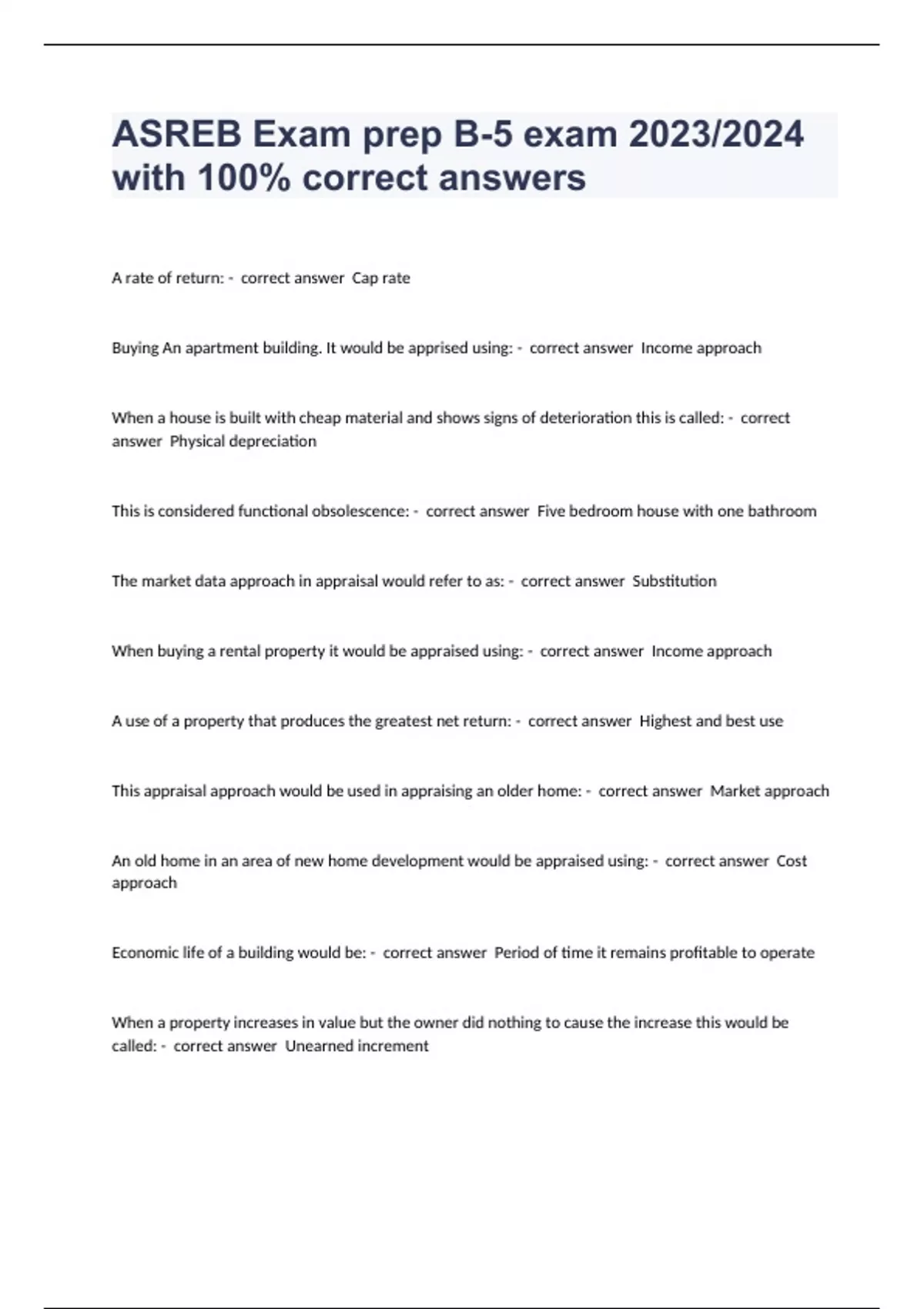 A rate of return: - correct answer Cap rate Buying An apartment building. It would be apprised using: - correct answer Income approach When a house is built with cheap material and shows signs of deterioration this is called: - correct answer Physical depreciation This is considered functional obsolescence: - correct answer Five bedroom house with one bathroom The market data approach in appraisal would refer to as: - correct answer Substitution When buying a rental property it would be appraised using: - correct answer Income approach A use of a property that produces the greatest net return: - correct answer Highest and best use This appraisal approach would be used in appraising an older home: - correct answer Market approach An old home in an area of new home development would be appraised using: - correct answer Cost approach Economic life of a building would be: - correct answer Period of time it remains profitable to operate When a property increases in value but the owner did nothing to cause the increase this would be called: - correct answer Unearned increment