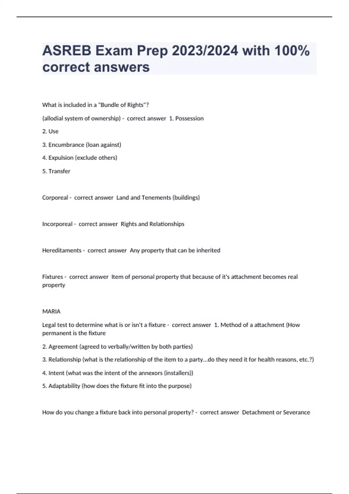 What is included in a "Bundle of Rights"? (allodial system of ownership) - correct answer 1. Possession 2. Use 3. Encumbrance (loan against) 4. Expulsion (exclude others) 5. Transfer Corporeal - correct answer Land and Tenements (buildings) Incorporeal - correct answer Rights and Relationships Hereditaments - correct answer Any property that can be inherited Fixtures - correct answer Item of personal property that because of it's attachment becomes real property MARIA Legal test to determine what is or isn't a fixture - correct answer 1. Method of a attachment (How permanent is the fixture 2. Agreement (agreed to verbally/written by both parties) 3. Relationship (what is the relationship of the item to a party...do they need it for health reasons, etc.?) 4. Intent (what was the intent of the annexors (installers)) 5. Adaptability (how does the fixture fit into the purpose) How do you
