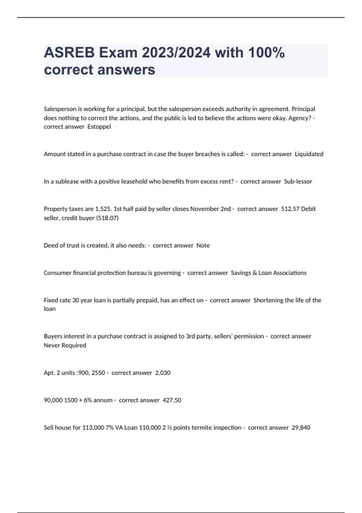 Salesperson is working for a principal, but the salesperson exceeds authority in agreement. Principal does nothing to correct the actions, and the public is led to believe the actions were okay. Agency? - correct answer Estoppel Amount stated in a purchase contract in case the buyer breaches is called: - correct answer Liquidated In a sublease with a positive leasehold who benefits from excess rent? - correct answer Sub-lessor Property taxes are 1,525. 1st half paid by seller closes November 2nd - correct answer 512.57 Debit seller, credit buyer (518.07) Deed of trust is created, it also needs: - correct answer Note Consumer financial protection bureau is governing - correct answer Savings & Loan Associations Fixed rate 30 year loan is partially prepaid, has an effect on - correct answer Shortening the life of the loan Buyers interest in a purchase contract is assigned to 3rd party, sellers' permission - correct answer Never Required Apt. 2 units :900, 2550 - correct answer 2,030 90,000 1500 + 6% annum - correct answer 427.50 Sell house for 113,000 7% VA Loan 110,000 2 ½ points termite inspection - correct answer 29,840
