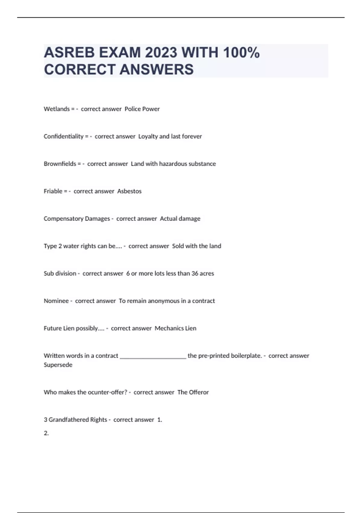 Wetlands = - correct answer Police Power Confidentiality = - correct answer Loyalty and last forever Brownfields = - correct answer Land with hazardous substance Friable = - correct answer Asbestos Compensatory Damages - correct answer Actual damage Type 2 water rights can be.... - correct answer Sold with the land Sub division - correct answer 6 or more lots less than 36 acres Nominee - correct answer To remain anonymous in a contract Future Lien possibly.... - correct answer Mechanics Lien Written words in a contract ____________________ the pre-printed boilerplate. - correct answer Supersede Who makes the ocunter-offer? - correct answer The Offeror 3 Grandfathered Rights - correct answer 1. 2. 3.