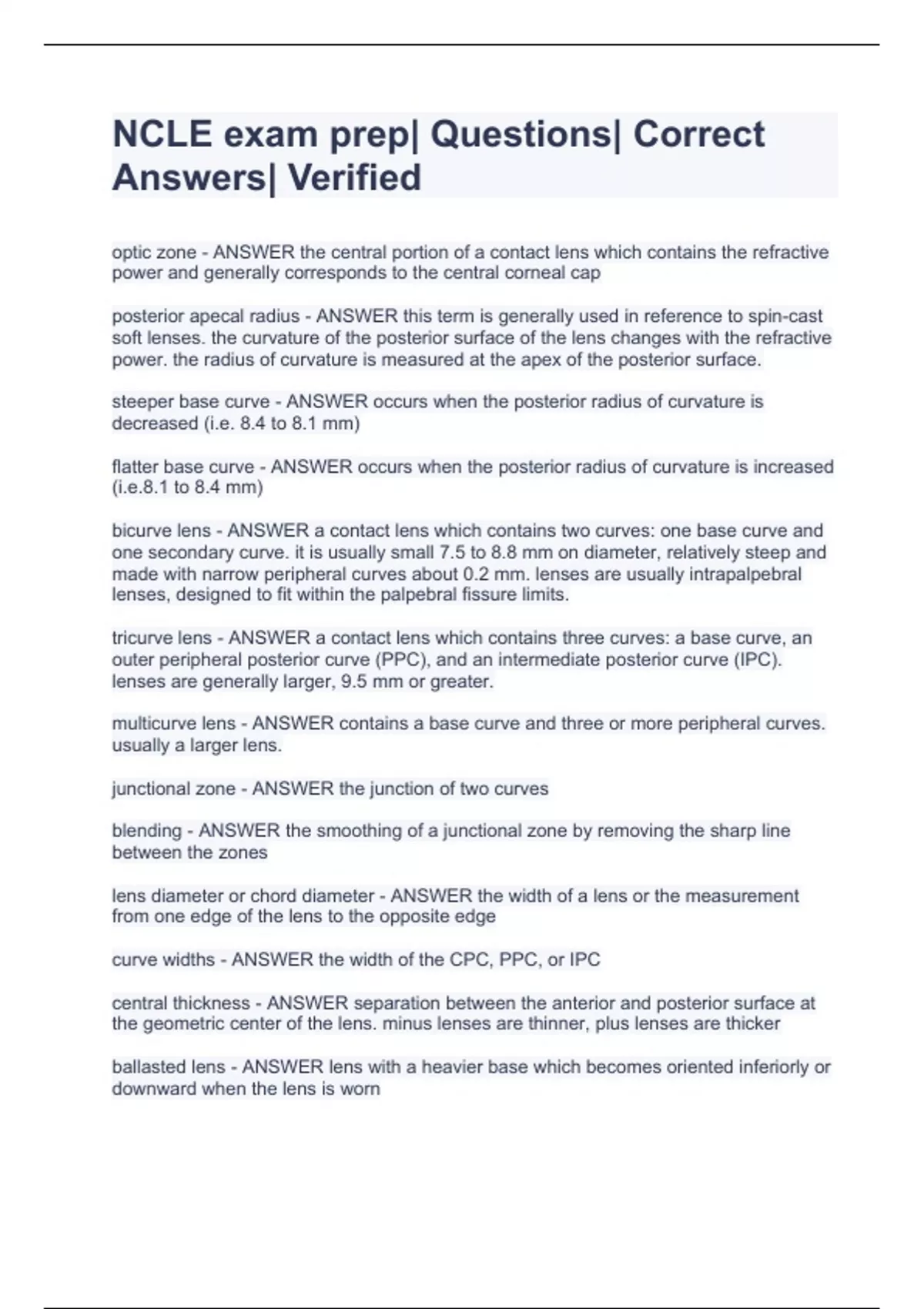 optic zone - ANSWER the central portion of a contact lens which contains the refractive power and generally corresponds to the central corneal cap posterior apecal radius - ANSWER this term is generally used in reference to spin-cast soft lenses. the curvature of the posterior surface of the lens changes with the refractive power. the radius of curvature is measured at the apex of the posterior surface. steeper base curve - ANSWER occurs when the posterior radius of curvature is decreased (i.e. 8.4 to 8.1 mm) flatter base curve - ANSWER occurs when the posterior radius of curvature is increased (i.e.8.1 to 8.4 mm) bicurve lens - ANSWER a contact lens which contains two curves: one base curve and one secondary curve. it is usually small 7.5 to 8.8 mm on diameter, relatively steep and made with narrow peripheral curves about 0.2 mm. lenses are usually intrapalpebral lenses, designed to fit within the palpebral fissure limits. tricurve lens - ANSWER a contact lens which contains three curves: a base curve, an outer peripheral posterior curve (PPC), and an intermediate posterior curve (IPC). lenses are generally larger, 9.5 mm or greater. multicurve lens - ANSWER contains a base curve and three or more peripheral curves. usually a larger lens. junctional zone - ANSWER the junction of two curves blending - ANSWER the smoothing of a junctional zone by removing the sharp line between the zones lens diameter or chord diameter - ANSWER the width of a lens or the measurement from one edge of the lens to the opposite edge curve widths - ANSWER the width of the CPC, PPC, or IPC central thickness - ANSWER separation between the anterior and posterior surface at the geometric center of the lens. minus lenses are thinner, plus lenses are thicker ballasted lens - ANSWER lens with a heavier base which becomes oriented inferiorly or downward when the lens is worn prism ballated lens - ANSWER a ballasted lens which utilizes a prism wedge designed to weight the lens truncated lens - ANSWER a lens which has been cut off, usually 0.5-1.5 mm along its lower edge, to form a horizontal base. double ________ along the top a