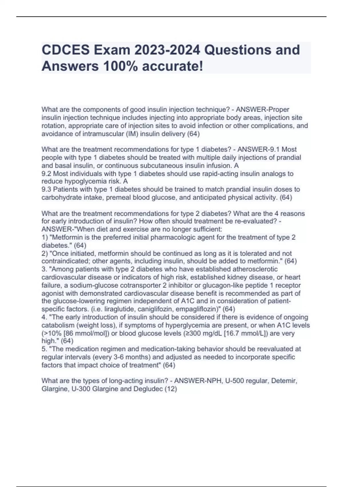 CDCES Exam Questions and Answers 100% accurate! CDCES Exam Questions and Answers 100% accurate! CDCES Exam Questions and Answers 100% accurate! What are the components of good insulin injection technique? - ANSWER-Proper insulin injection technique includes injecting into appropriate body areas, injection site rotation, appropriate care of injection sites to avoid infection or other complications, and avoidance of intramuscular (IM) insulin delivery (64) What are the treatment recommendations for type 1 diabetes? - ANSWER-9.1 Most people with type 1 diabetes should be treated with multiple daily injections of prandial and basal insulin, or continuous subcutaneous insulin infusion. A 9.2 Most individuals with type 1 diabetes should use rapid-acting insulin analogs to reduce hypoglycemia risk. A 9.3 Patients with type 1 diabetes should be trained to match prandial insulin doses to carbohydrate intake, premeal blood glucose, and anticipated physical activity. (64) What are the treatment recommendations for type 2 diabetes? What are the 4 reasons for early introduction of insulin? How often should treatment be re-evaluated? - ANSWER-"When diet and exercise are no longer sufficient: 1) "Metformin is the preferred initial pharmacologic agent for the treatment of type 2 diabetes." (64) 2) "Once initiated, metformin should be continued as long as it is tolerated and not contraindicated; other agents, including insulin, should be added to metformin." (64) 3. "Among patients with type 2 diabetes who have established atherosclerotic cardiovascular disease or indicators of high risk, established kidney disease, or heart failure, a sodium-glucose cotransporter 2 inhibitor or glucagon-like peptide 1 receptor agonist with demonstrated cardiovascular disease benefit is recommended as part of the glucose-lowering regimen independent of A1C and in consideration of patient-specific factors. (i.e. liraglutide, caniglifozin, empagliflozin)" (64) 4. "The early introduction of insulin should be considered if there is evidence of ongoing catabolism (weight loss), if symptoms of hyperglycemia are present, or when A1C levels (>10% [86 mmol/mol]) or blood glucose levels (≥300 mg/dL [16.7 mmol/L]) are very high." (64) 5. "The medication regimen and medication-taking behavior should be reevaluated at regular intervals (every 3-6 months) and adjusted as needed to incorporate specific factors that impact choice of treatment" (64) What are the types of long-acting insulin? - ANSWER-NPH, U-500 regular, Detemir, Glargine, U-300 Glargine and Degludec (12)