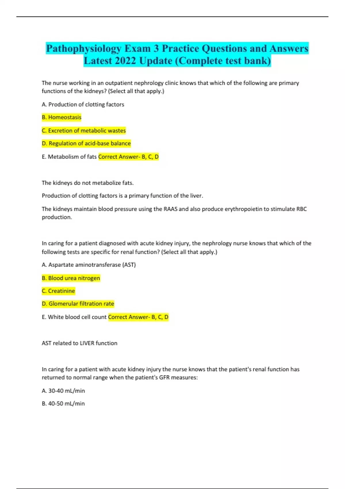 The nurse working in an outpatient nephrology clinic knows that which of the following are primary functions of the kidneys? (Select all that apply.) A. Production of clotting factors B. Homeostasis C. Excretion of metabolic wastes D. Regulation of acid-base balance E. Metabolism of fats Correct Answer- B, C, D The kidneys do not metabolize fats. Production of clotting factors is a primary function of the liver. The kidneys maintain blood pressure using the RAAS and also produce erythropoietin to stimulate RBC production. In caring for a patient diagnosed with acute kidney injury, the nephrology nurse knows that which of the following tests are specific for renal function? (Select all that apply.) A. Aspartate aminotransferase (AST) B. Blood urea nitrogen C. Creatinine D. Glomerular filtration rate E. White blood cell count Correct Answer- B, C, D AST related to LIVER function In caring for a patient with acute kidney injury the nurse knows that the patient's renal function has returned to normal range when the patient's GFR measures: A. 30-40 mL/min B. 40-50 mL/min C. 70-90 mL/min D. 90-120 mL/min Correct Answer- D Normal GFR is 90-120 mL/min Normal Creatinine 0.6-1.1 for females and 0.6-1.2 for males Normal BUN is 10-20 mg/dL *Be sure to know these normal values, you will use them daily as a nurse The nursing working in a geriatric living facility understands that as patients age, which change in glomerular filtration rate is expected? A. Increased GFR B. Decreased GFR C. Same GFR D. No GFR Correct Answer- B Aging and renal function: Decrease in renal blood flow and GFR → altered sodium and water balance Number of nephrons decrease due to renal vascular and perfusion changes Response to acid-base changes is delayed Increased risk for drug toxicity Alterations in thirst and water intake Get dehydrated very easily; do not recognize thirst and heat Decreased muscle mass may lead to decreased creatinine values An older patient is experiencing urinary stasis. The registered nurse knows that urinary stasis may lead to which of the following? A. Increased GFR B. Hypocoagulation C. Hypertension D. Infection Correct Answer- D Urinary stasis is a risk factor for developing UTI Which of the following is classified as the most common primary mineral salt composition of kidney stones? A. Calcium B. Struvite C. Uric Acid D. Cysteine Correct Answer- A