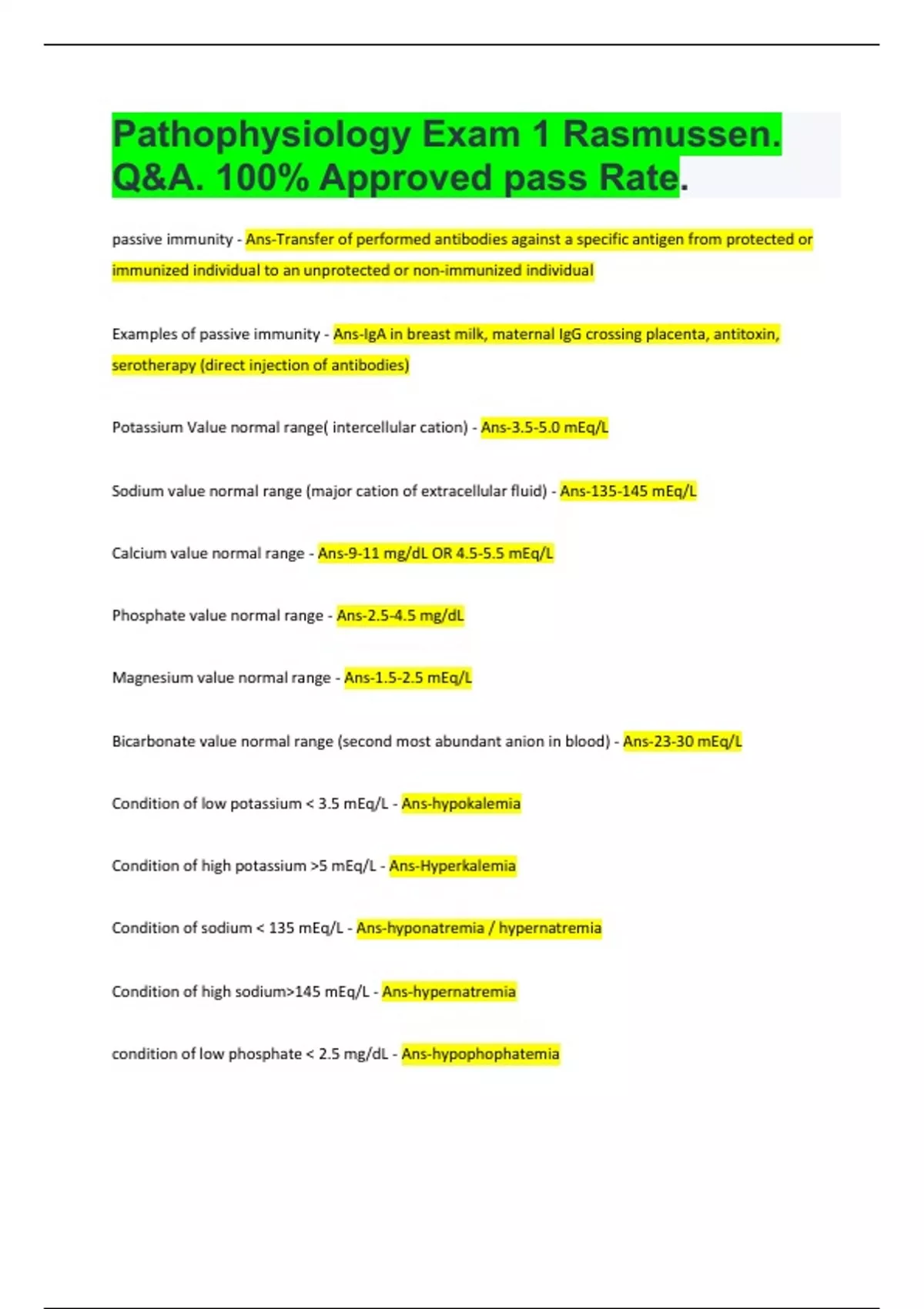 Pathophysiology Exam 1 Rasmussen. Q&A. 100% Approved pass Rate. passive immunity - Ans-Transfer of performed antibodies against a specific antigen from protected or immunized individual to an unprotected or non-immunized individual Examples of passive immunity - Ans-IgA in breast milk, maternal IgG crossing placenta, antitoxin, serotherapy (direct injection of antibodies) Potassium Value normal range( intercellular cation) - Ans-3.5-5.0 mEq/L Sodium value normal range (major cation of extracellular fluid) - Ans-135-145 mEq/L Calcium value normal range - Ans-9-11 mg/dL OR 4.5-5.5 mEq/L Phosphate value normal range - Ans-2.5-4.5 mg/dL Magnesium value normal range - Ans-1.5-2.5 mEq/L Bicarbonate value normal range (second most abundant anion in blood) - Ans-23-30 mEq/L Condition of low potassium < 3.5 mEq/L - Ans-hypokalemia Condition of high potassium >5 mEq/L - Ans-Hyperkalemia Condition of sodium < 135 mEq/L - Ans-hyponatremia / hypernatremia Condition of high sodium>145 mEq/L - Ans-hypernatremia condition of low phosphate < 2.5 mg/dL - Ans-hypophophatemia