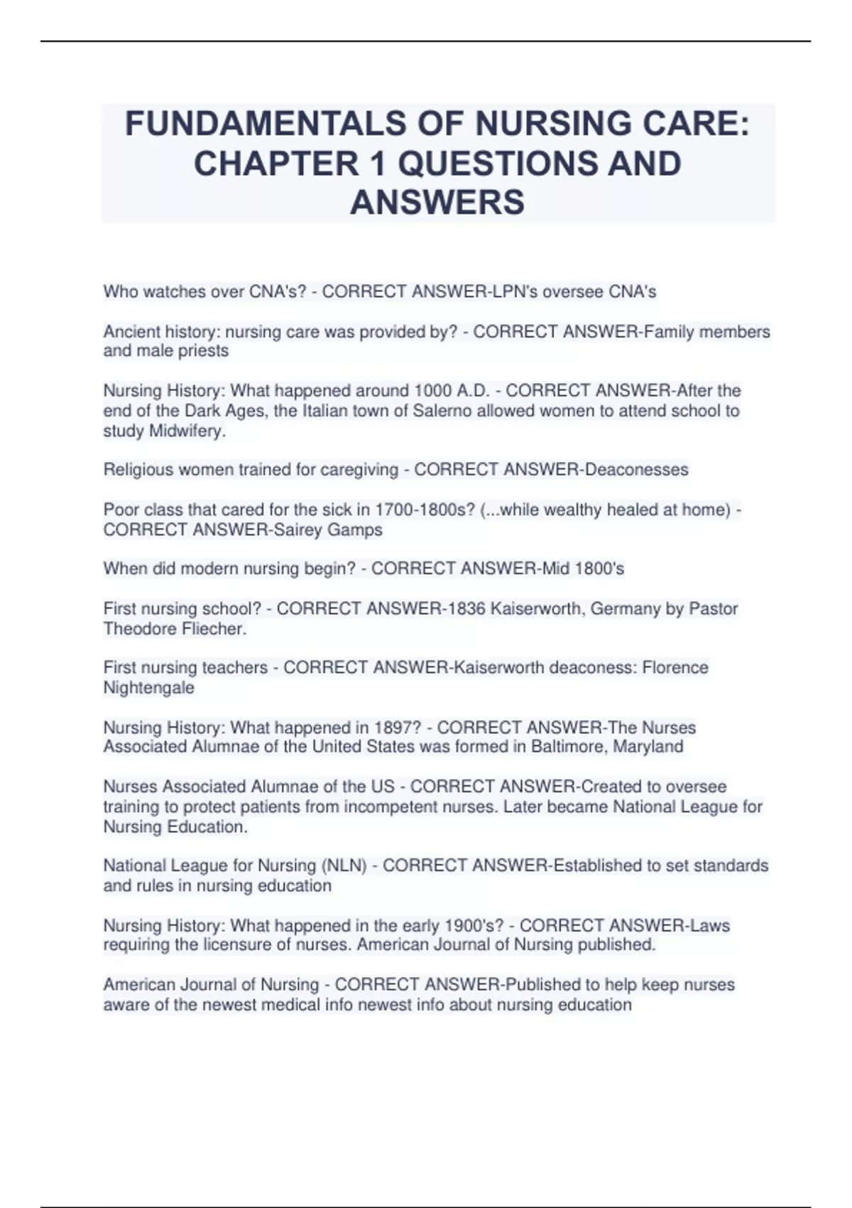 FUNDAMENTALS OF NURSING CARE: CHAPTER 1 QUESTIONS AND ANSWERS Who watches over CNA's? - CORRECT ANSWER-LPN's oversee CNA's Ancient history: nursing care was provided by? - CORRECT ANSWER-Family members and male priests Nursing History: What happened around 1000 A.D. - CORRECT ANSWER-After the end of the Dark Ages, the Italian town of Salerno allowed women to attend school to study Midwifery. Religious women trained for caregiving - CORRECT ANSWER-Deaconesses Poor class that cared for the sick in s? (...while wealthy healed at home) - CORRECT ANSWER-Sairey Gamps When did modern nursing begin? - CORRECT ANSWER-Mid 1800's First nursing school? - CORRECT ANSWER-1836 Kaiserworth, Germany by Pastor Theodore Fliecher. First nursing teachers - CORRECT ANSWER-Kaiserworth deaconess: Florence Nightengale Nursing History: What happened in 1897? - CORRECT ANSWER-The Nurses Associated Alumnae of the United States was formed in Baltimore, Maryland Nurses Associated Alumnae of the US - CORRECT ANSWER-Created to oversee training to protect patients from incompetent nurses. Later became National League for Nursing Education. National League for Nursing (NLN) - CORRECT ANSWER-Established to set standards and rules in nursing education Nursing History: What happened in the early 1900's? - CORRECT ANSWER-Laws requiring the licensure of nurses. American Journal of Nursing published. American Journal of Nursing - CORRECT ANSWER-Published to help keep nurses aware of the newest medical info newest info about nursing education Nursing History: What happened in 1892? - CORRECT ANSWER-The first training program for practical nurses was established in New York City at the Young Women's Christian Association (YWCA). Ballard school formed following year through YWCA. Ballard school (through YWCA) - CORRECT ANSWER-Educated bedside/home health nurses. 3 month program focused on homemaking and caring for the sick. Nursing History: What happened in 1955? - CORRECT ANSWER-LPN/LVN Title established. All states required PRACTICAL nurses to be licensed. Clara Barton - CORRECT ANSWER-1st president Red Cross. "Angel of the battlefield" in Civil War. Dorothea Dix - CORRECT ANSWER-Better mental health. Est psychiatric hospitals. Superintendent of female nurses in Army in 1861. Florence Nightingale - CORRECT ANSWER-Modern nursing. Kaiserworth deaconess. Sisters of charity. Crimean war. Nightengale school. Mary Mahoney - CORRECT ANSWER-1st African American nurse in US Linda Richards - CORRECT ANSWER-1st "trained nurse" in the US. Nurse's notes. Est 1st school in Japan. Isabel Hampton Robb - CORRECT ANSWER-12-hour shifts with meal breaks. Pushed 3 yr training program, licensure exam, and registration. Nutting - CORRECT ANSWER-"Great trio". 1st prof of nursing. Graduated Johns Hopkins. Est Nursing and Teachers college at Columbia. Wald - CORRECT ANSWER-"Great trio". 1st visiting nurse. Opened Henry St. Settlement to provide care for poor. Goodrich - CORRECT ANSWER-"Great trio". Received Distinguisged Service award for Army School of Nursing. Director of Visiting Nurse Service. Dean of nursing at Yale. President of ANA. Licensed Practical/Vocational Nurse: - CORRECT ANSWER-- 9 to 12 months of school FT -18mo to 2yr PT program - Technical College/Career Technology Center Registered Nurse Associates Degree: - CORRECT ANSWER-- ADN - 2 to 3 years - Community College/State College Registered Nurse - Diploma Program: - CORRECT ANSWER-- 3 years - Hospital based program affiliated with University or College Registered Nurse - Baccalaureate Degree: - CORRECT ANSWER-- 4 years - College/University Master of Science in Nursing (MSN): - CORRECT ANSWER-- 2 more years - May teach BSN, ADN, and LPN Advanced Nursing Specialists: - CORRECT ANSWER-- Clinical Nurse Specialist - Nurse Practitioner - Certified Registered Nurse Anesthetist - Nurse Midwife Doctorate in Nursing (PhD, DNP): - CORRECT ANSWER-- 2 more years - May serve as the Dean of Nursing at College - Director of Nursing - May teach Doctorate or MSN Nursing Practice Act (NPA's) in all states have this in common: - CORRECT ANSWER1) RN supervised by Physician 2) LPN/LVN supervised by RN 3) Establishes scope of practice for each level of nurse based on educational preparation. 4) Board of Nursing in each state determines and enforces the content of the states NPA. Nurse Practice Act: - CORRECT ANSWER-- Law governing nurses' actions. - Addresses each specific level of nursing. - Establishes scope of practice for each level of nurse, based on educational preparation. - Enforced by the Board of Nursing. Scope of Practice: - CORRECT ANSWER-- Limitations & allowances of what a nurse can do. - Nurses responsible for knowing their own scope of practice. Four characteristics of Competent Nurses: - CORRECT ANSWER-1) Being Responsible 2) Being Honest 3) Being Caring 4) Being Competent Nursing Responsibilities: - CORRECT ANSWER-- Caring for several patients & seeing that their physical & spiritual needs are met. -