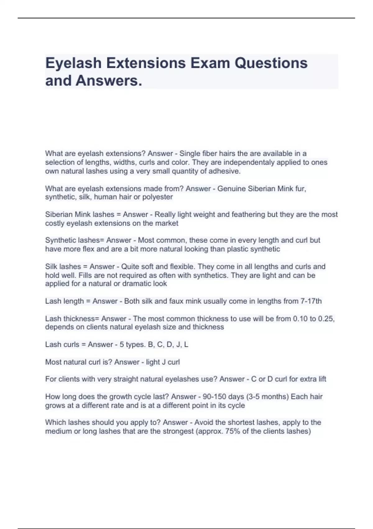 Eyelash Extensions Exam Questions and Answers.