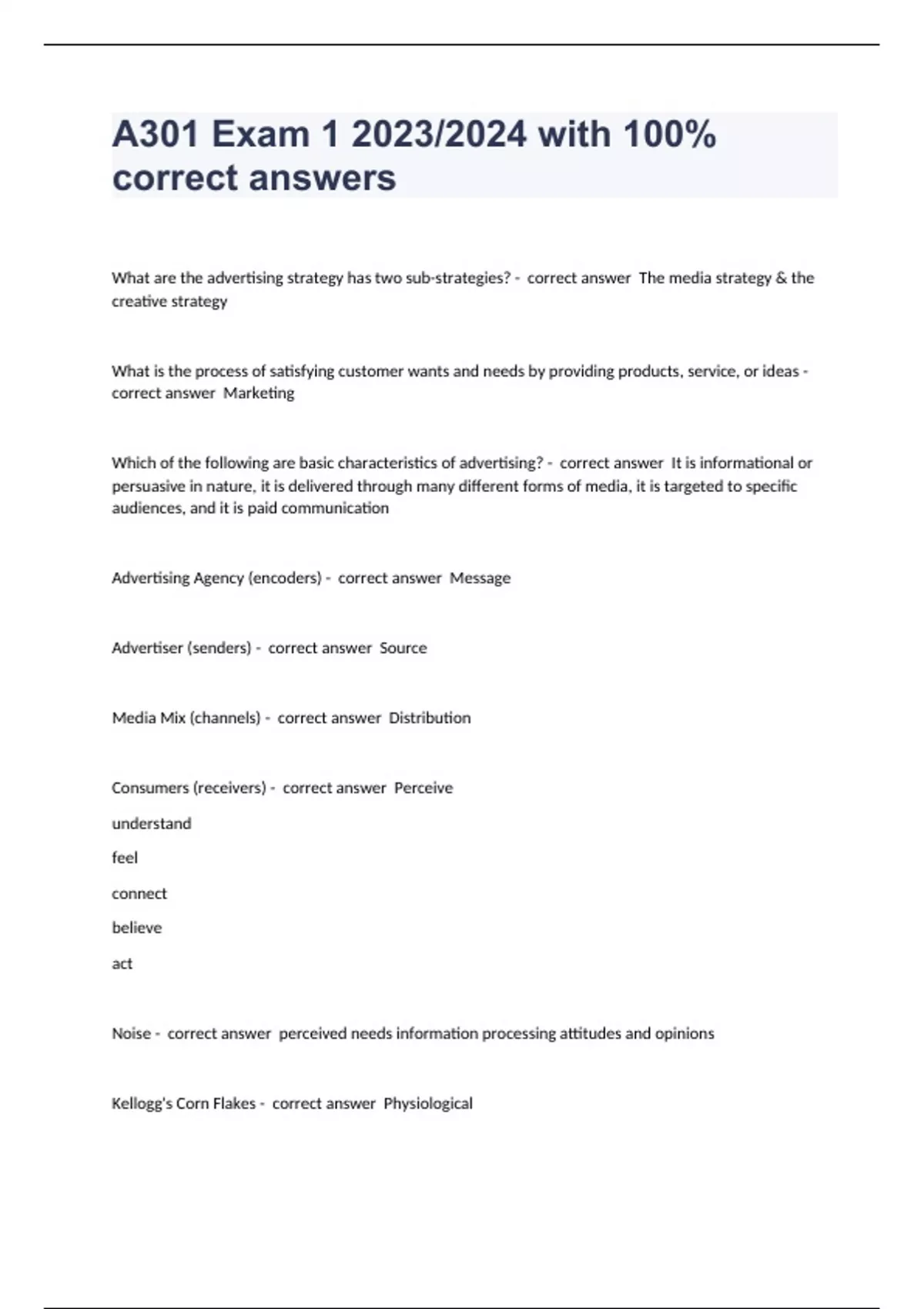 What are the advertising strategy has two sub-strategies? - correct answer The media strategy & the creative strategy What is the process of satisfying customer wants and needs by providing products, service, or ideas - correct answer Marketing Which of the following are basic characteristics of advertising? - correct answer It is informational or persuasive in nature, it is delivered through many different forms of media, it is targeted to specific audiences, and it is paid communication Advertising Agency (encoders) - correct answer Message Advertiser (senders) - correct answer Source Media Mix (channels) - correct answer Distribution Consumers (receivers) - correct answer Perceive understand feel connect believe act Noise - correct answer perceived needs information processing attitudes and opinions Kellogg'