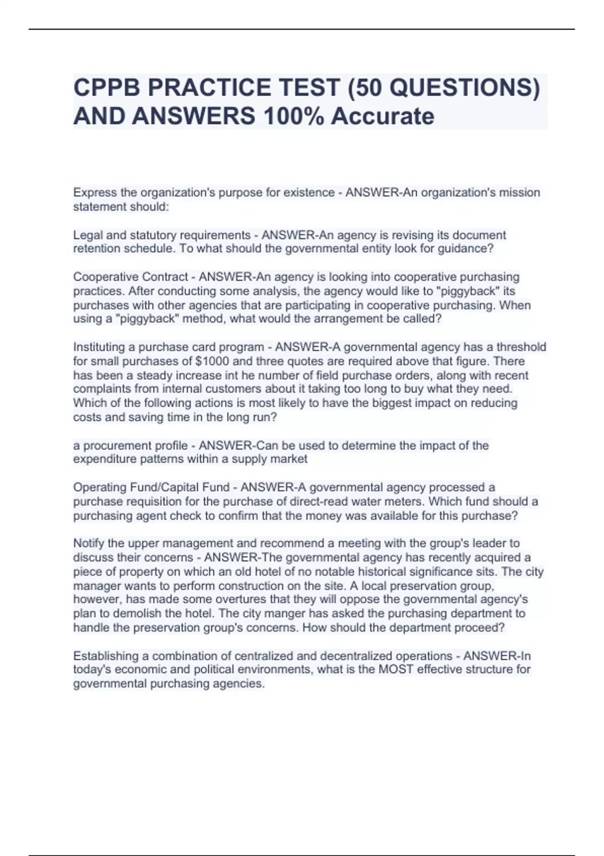 CPPB PRACTICE TEST (50 QUESTIONS) AND ANSWERS 100% Accurate