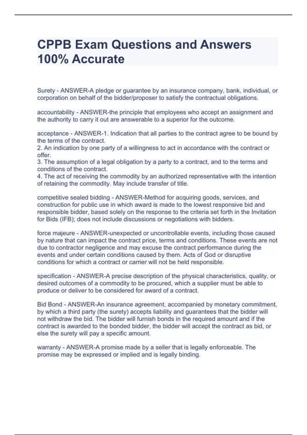 CPPB Exam Questions and Answers 100% AccurateSurety - ANSWER-A pledge or guarantee by an insurance company, bank, individual, or corporation on behalf of the bidder/proposer to satisfy the contractual obligations. accountability - ANSWER-the principle that employees who accept an assignment and the authority to carry it out are answerable to a superior for the outcome. acceptance - ANSWER-1. Indication that all parties to the contract agree to be bound by the terms of the contract. 2. An indication by one party of a willingness to act in accordance with the contract or offer. 3. The assumption of a legal obligation by a party to a contract, and to the terms and conditions of the contract. 4. The act of receiving the commodity by an authorized representative with the intention of retaining the commodity. May include transfer of title. competitive sealed bidding - ANSWER-Method for acquiring goods, services, and construction for public use in which award is made to the lowest responsive bid and responsible bidder, based solely on the response to the criteria set forth in the Invitation for Bids (IFB); does not include discussions or negotiations with bidders. force majeure - ANSWER-unexpected or uncontrollable events, including those caused by nature that can impact the contract price, terms and conditions. These events are not due to contractor negligence and may excuse the contract performance during the events and under certain conditions caused by them. Acts of God or disruptive conditions for which a contract or carrier will not be held responsible. specification - ANSWER-A precise description of the physical characteristics, quality, or desired outcomes of a commodity to be procured, which a supplier must be able to produce or deliver to be considered for award of a contract. Bid Bond - ANSWER-An insurance agreement, accompanied by monetary commitment, by which a third party (the surety) accepts liability and guarantees that the bidder will not withdraw the bid. The bidder will furnish bonds in the required amount and if the contract is awarded to the bonded bidder, the bidder will accept the contract as bid, or else the surety will pay a specific amount. warranty - ANSWER-A promise made by a seller that is legally enforceable. The promi