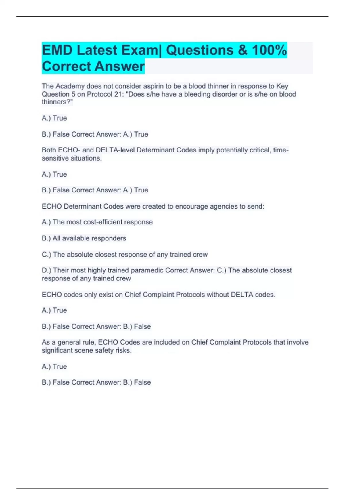 EMD Latest Exam| Questions & 100% Correct Answer The Academy does not consider aspirin to be a blood thinner in response to Key Question 5 on Protocol 21: "Does s/he have a bleeding disorder or is s/he on blood thinners?" A.) True B.) False Correct Answer: A.) True Both ECHO- and DELTA-level Determinant Codes imply potentially critical, time-sensitive situations. A.) True B.) False Correct Answer: A.) True ECHO Determinant Codes were created to encourage agencies to send: A.) The most cost-efficient response B.) All available responders C.) The absolute closest response of any trained crew D.) Their most highly trained paramedic Correct Answer: C.) The absolute closest response of any trained crew ECHO codes only exist on Chief Complaint Protocols without DELTA codes. A.) True B.) False Correct Answer: B.) False As a general rule, ECHO Codes are included on Chief Complaint Protocols that involve significant scene safety risks. A.) True B.) False Correct Answer: B.) False You will sometimes have enough information after hearing the caller's response to, "Okay, tell me exactly what happened," to immediately initiate an ECHO response for the patient. A.) True B.) False Correct Answer: A.) True Which of the following complaints represents a situation that, without obtaining any