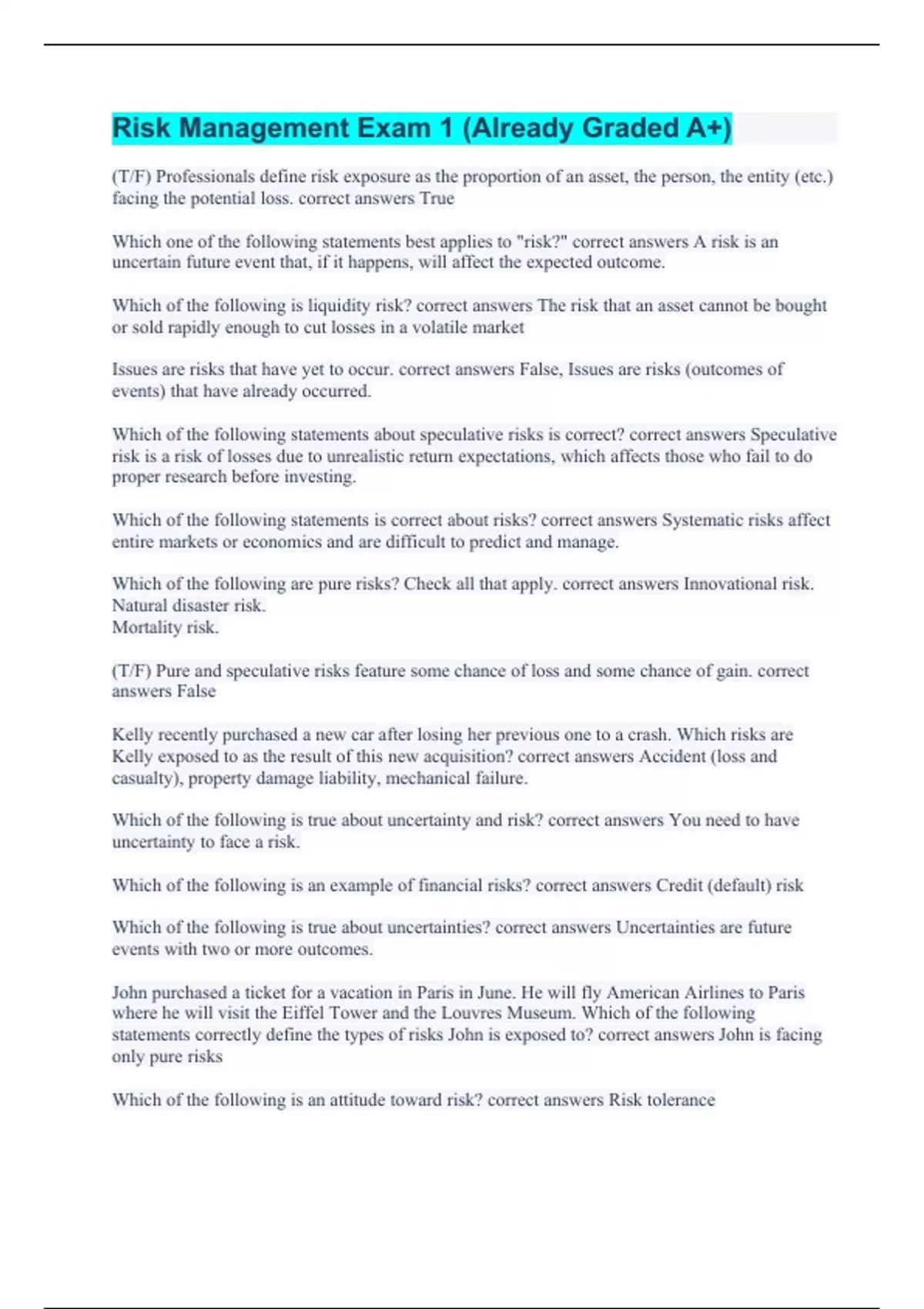 (T/F) Professionals define risk exposure as the proportion of an asset, the person, the entity (etc.) facing the potential loss. correct answers True Which one of the following statements best applies to "risk?" correct answers A risk is an uncertain future event that, if it happens, will affect the expected outcome. Which of the following is liquidity risk? correct answers The risk that an asset cannot be bought or sold rapidly enough to cut losses in a volatile market Issues are risks that have yet to occur. correct answers False, Issues are risks (outcomes of events) that have already occurred. Which of the following statements about speculative risks is correct? correct answers Speculative risk is a risk of losses due to unrealistic return expectations, which affects those who fail to do proper research before investing. Which of the following statements is correct about risks? correct answers Systematic risks affect entire markets or economics and are difficult to predict and manage. Which of the following are pure risks? Check all that apply. correct answers Innovational risk. Natural disaster risk. Mortality risk. (T/F) Pure and speculative risks feature some chance of loss and some chance of gain. correct answers False Kelly recently purchased a new car after losing her previous one to a crash. Which risks are Kelly exposed to as the result of this new acquisition? correct answers Accident (loss and casualty), property damage liability, mechanical failure. Which of the following is true about uncertainty and risk? correct answers You need to have uncertainty to face a risk. Which of the following is an example of financial risks? correct answers Credit (default) risk Which of the following is true about uncertainties? correct answers Uncertainties are future events with two or more outcomes. John purchased a ticket for a vacation in Paris in June. He will fly American Airlines to Paris where he will visit the Eiffel Tower and the Louvres Museum. Which of the following statements correctly define the types of risks John is exposed to? correct answers John is facing only pure risks Which of the following is an attitude toward risk? correct answers Risk tolerance