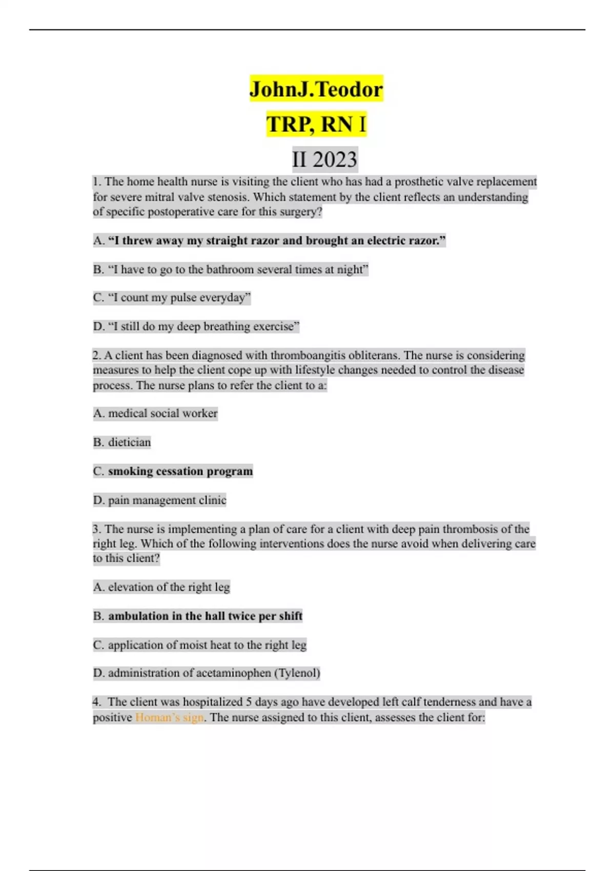 1. The home health nurse is visiting the client who has had a prosthetic valve replacement