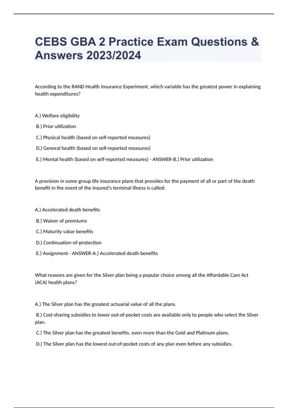 CEBS GBA 2 Practice Exam Questions & Answers 2023/2024 According to the RAND Health Insurance Experiment, which variable has the greatest power in explaining health expenditures? A.) Welfare eligibility B.) Prior utilization C.) Physical health (based on self-reported measures) D.) General health (based on self-reported measures) E.) Mental health (based on self-reported measures) - ANSWER-B.) Prior utilization A provision in some group life insurance plans that provides for the payment of all or part of the death benefit in the event of the insured's terminal illness is called: A.) Accelerated death benefits B.) Waiver of premiums C.) Maturity value benefits D.) Continuation-of-protection E.) Assignment - ANSWER-A.) Accelerated death benefits What reasons are given for the Silver plan being a popular choice among all the Affordable Care Act (ACA) health plans? A.) The Silver plan has the greatest actuarial value of all the plans. B.) Cost-sharing subsidies to lower out-of-pocket costs are available only to people who select the Silver plan. C.) The Silver plan has the greatest benefits, even more than the Gold and Platinum plans. D.) The Silver plan has the lowest out-of-pocket costs of any plan even before any subsidies.