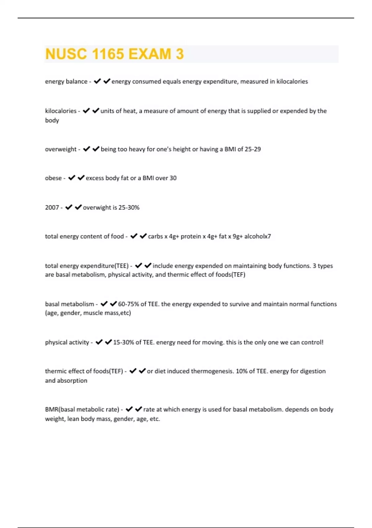 energy balance - energy consumed equals energy expenditure, measured in kilocalories kilocalories - units of heat, a measure of amount of energy that is supplied or expended by the body overweight - being too heavy for one's height or having a BMI of 25-29 obese - excess body fat or a BMI over 30 2007 - overwight is 25-30% total energy content of food - carbs x 4g+ protein x 4g+ fat x 9g+ alcoholx7 total energy expenditure(TEE) - include energy expended on maintaining body functions. 3 types are basal metabolism, physical activity, and thermic effect of foods(TEF)