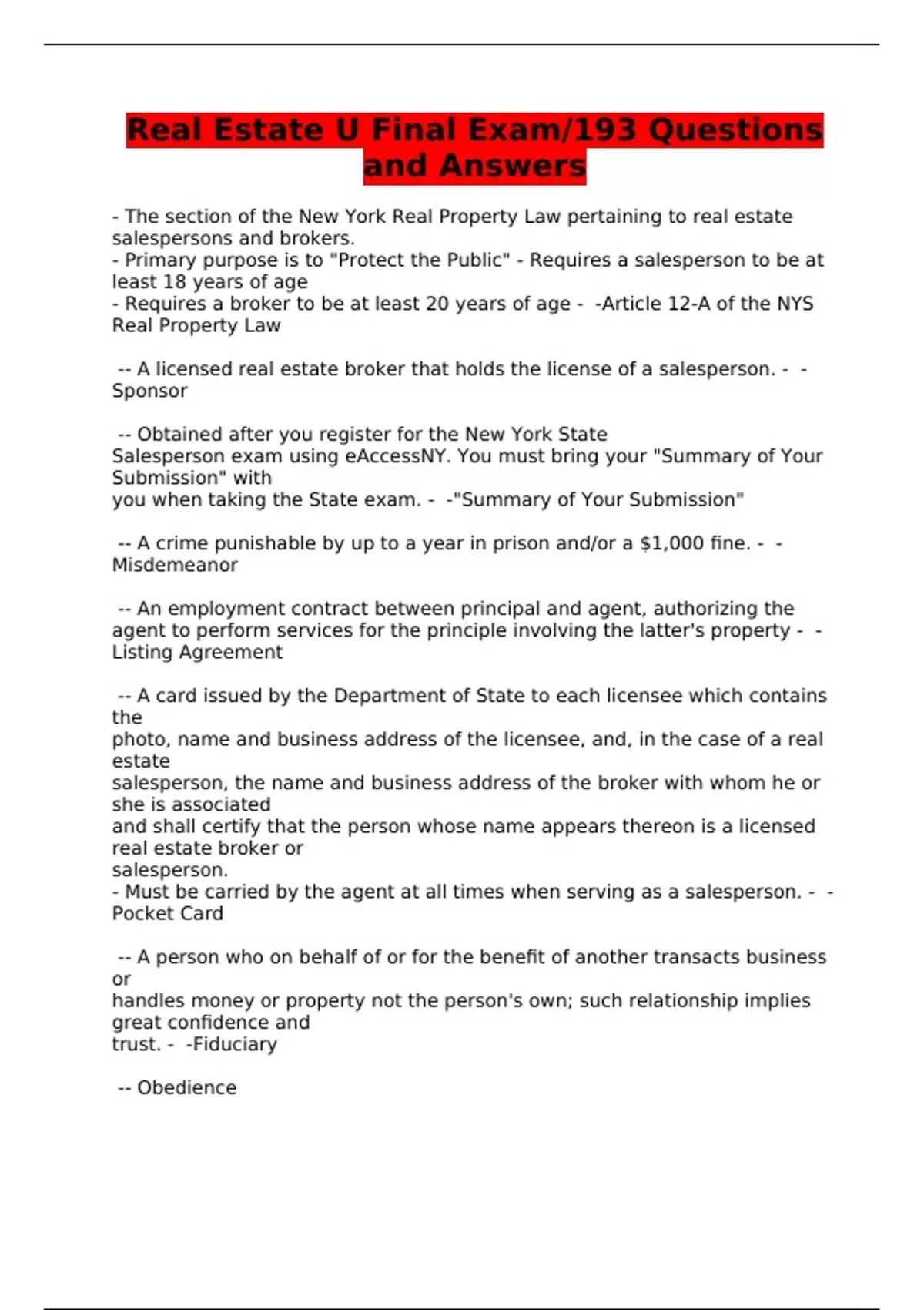 Real Estate U Final Exam/193 Questions and Answers