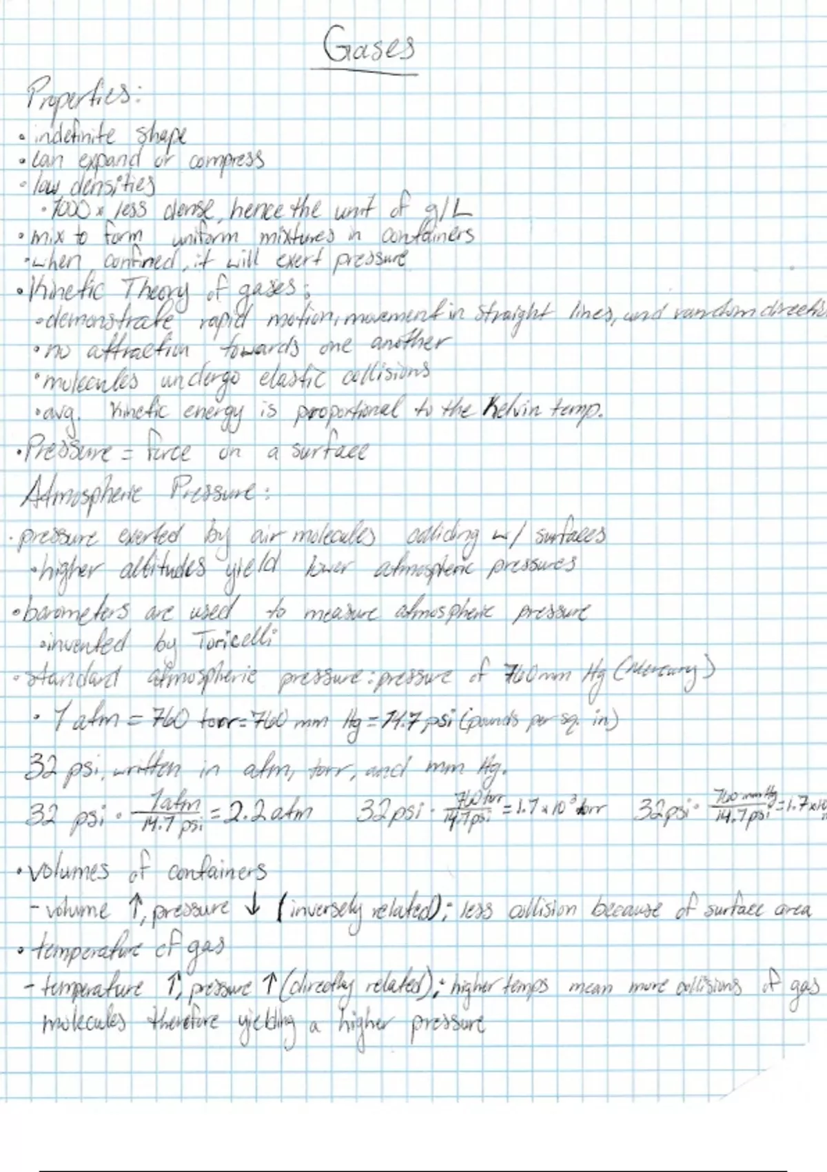 Notes and example problems for gases, gas behaviors, laws, and how they interact with pressure, volume, and temperature.