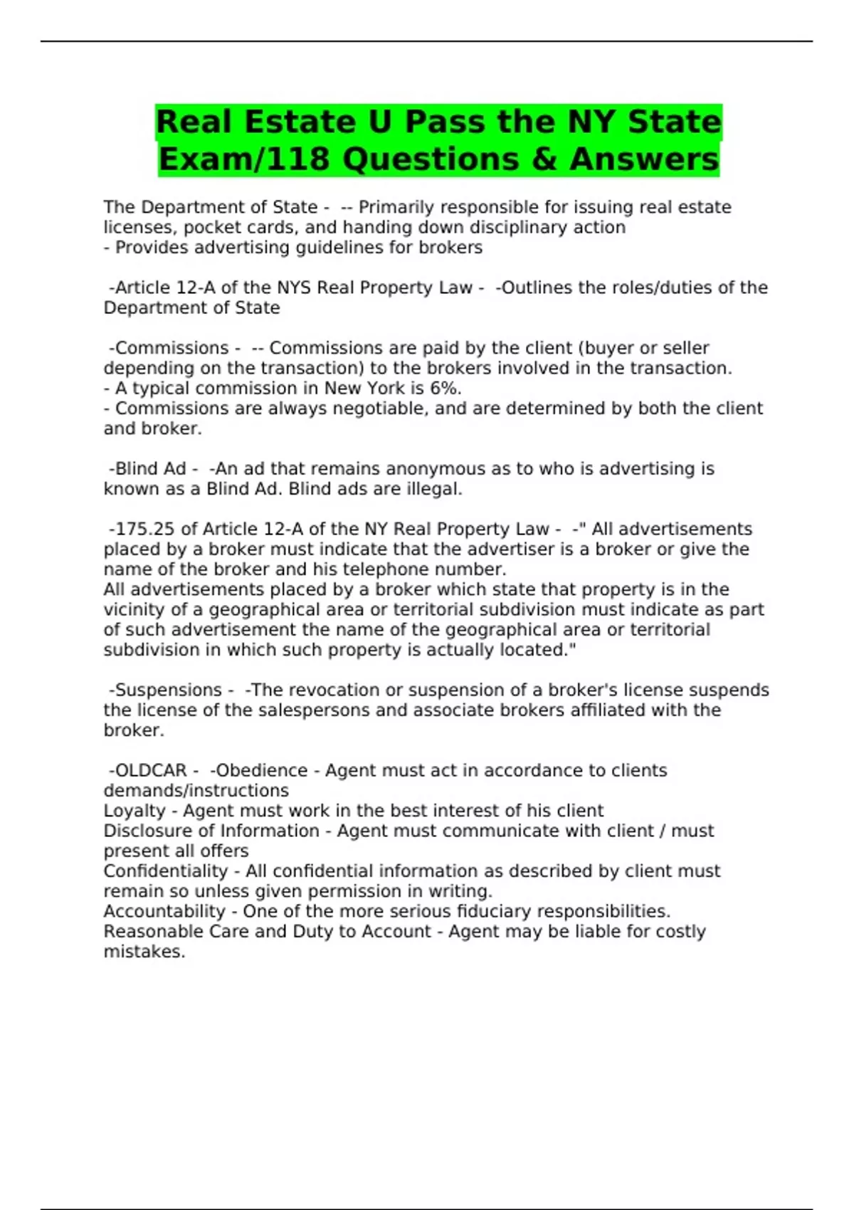 Real Estate U Pass the NY State Exam/118 Questions & Answers