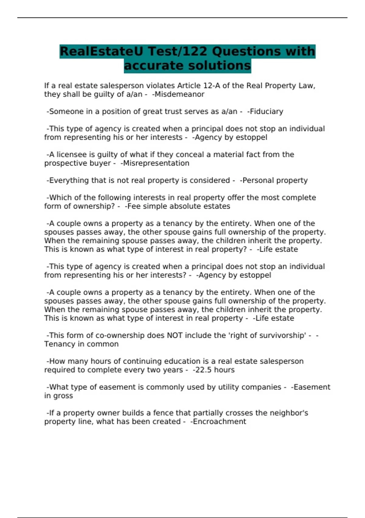 RealEstateU Test/122 Questions with accurate solutions