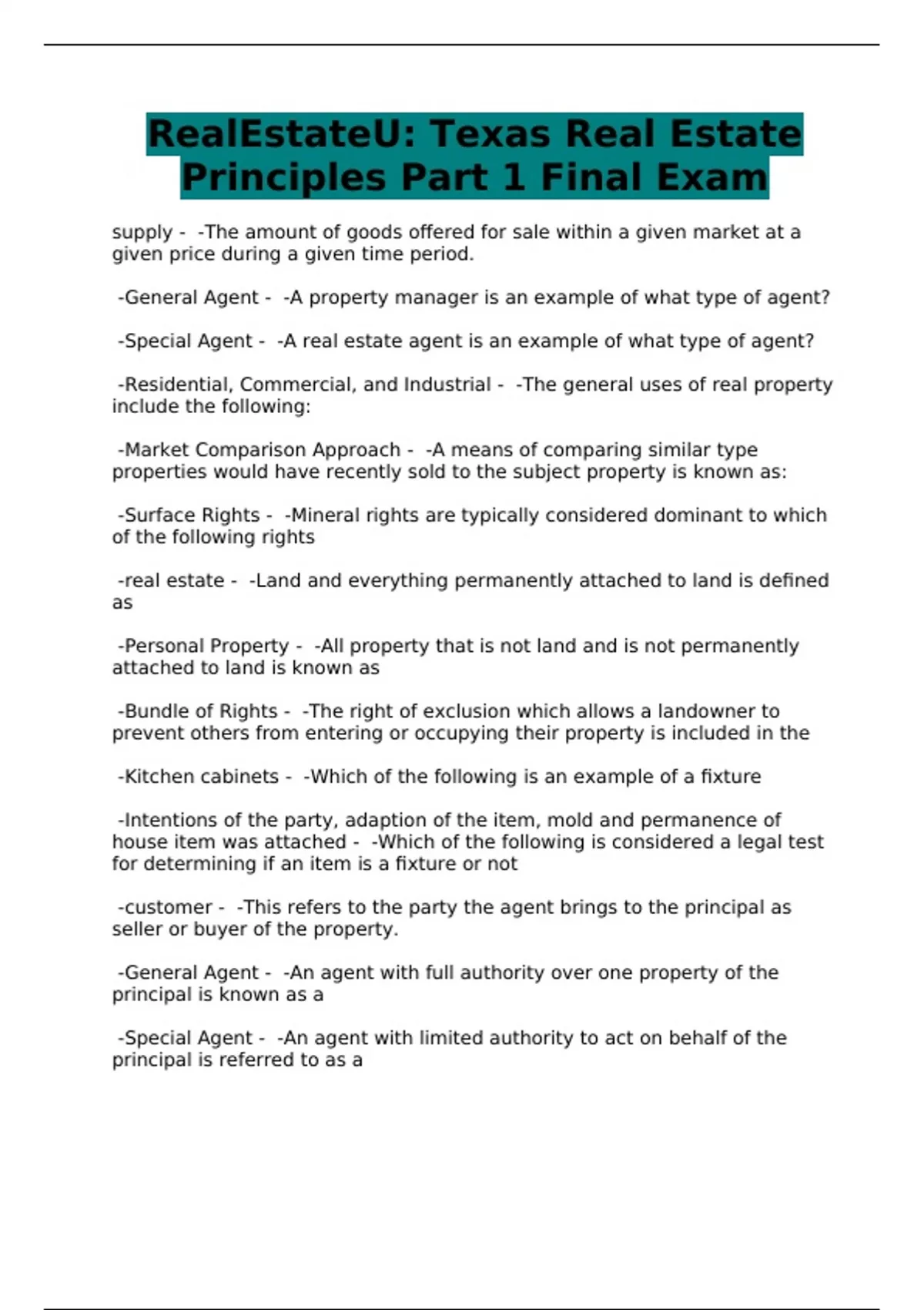 RealEstateU: Texas Real Estate Principles Part 1 Final Exam