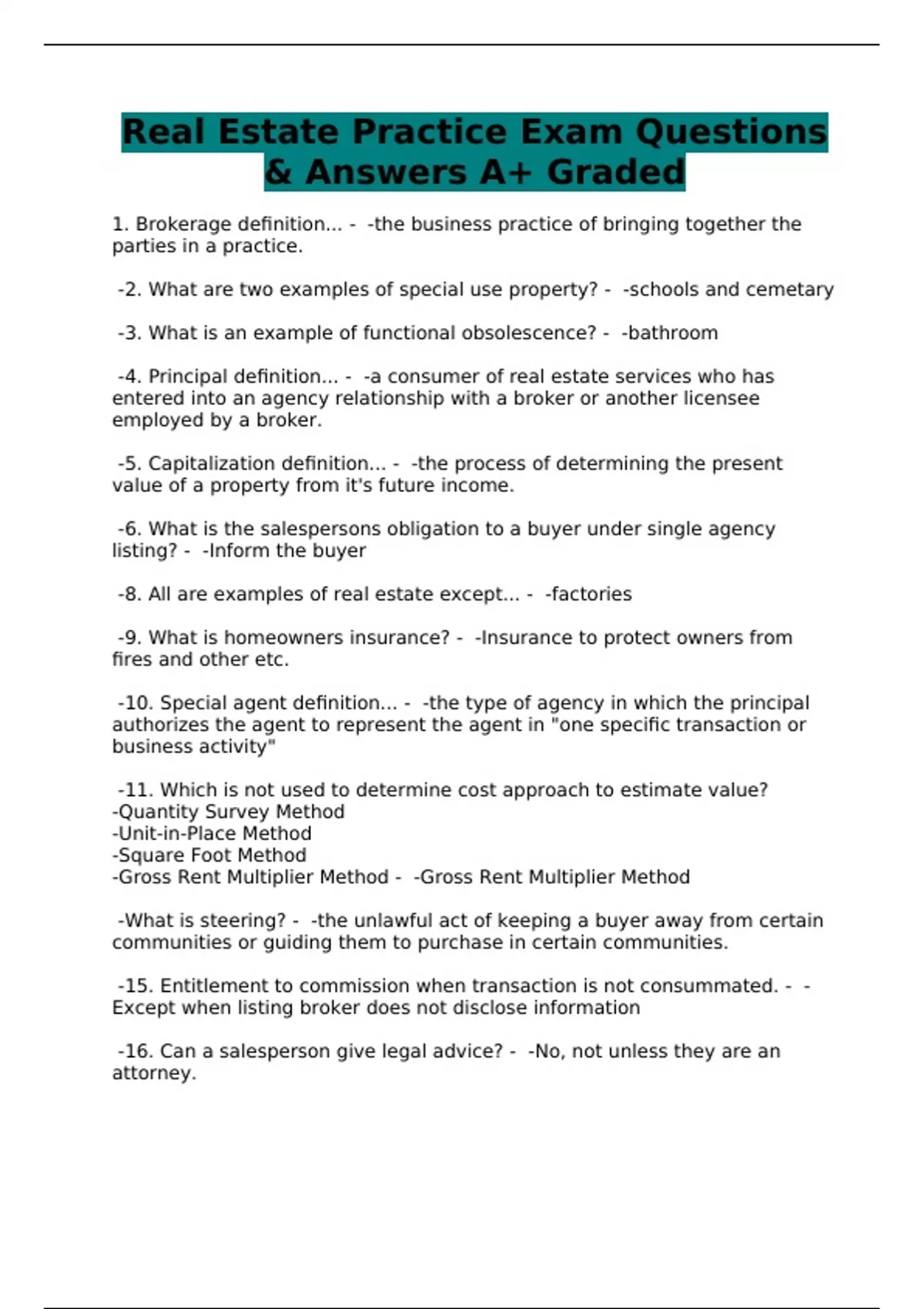 Real Estate Practice Exam Questions & Answers A+ Graded