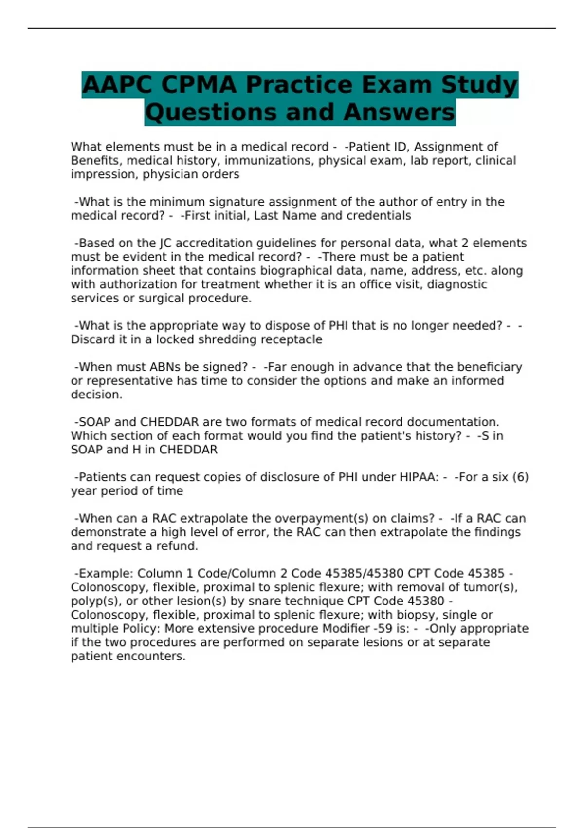AAPC CPMA Practice Exam Study Questions and Answers