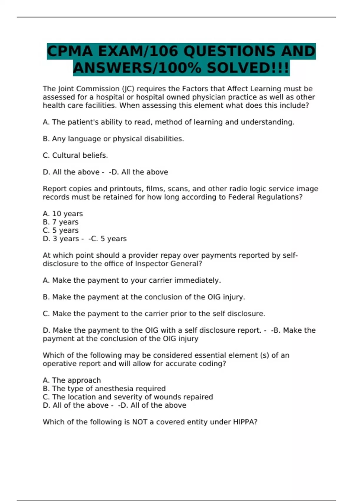 cpma exam106 questions and answers100 solved