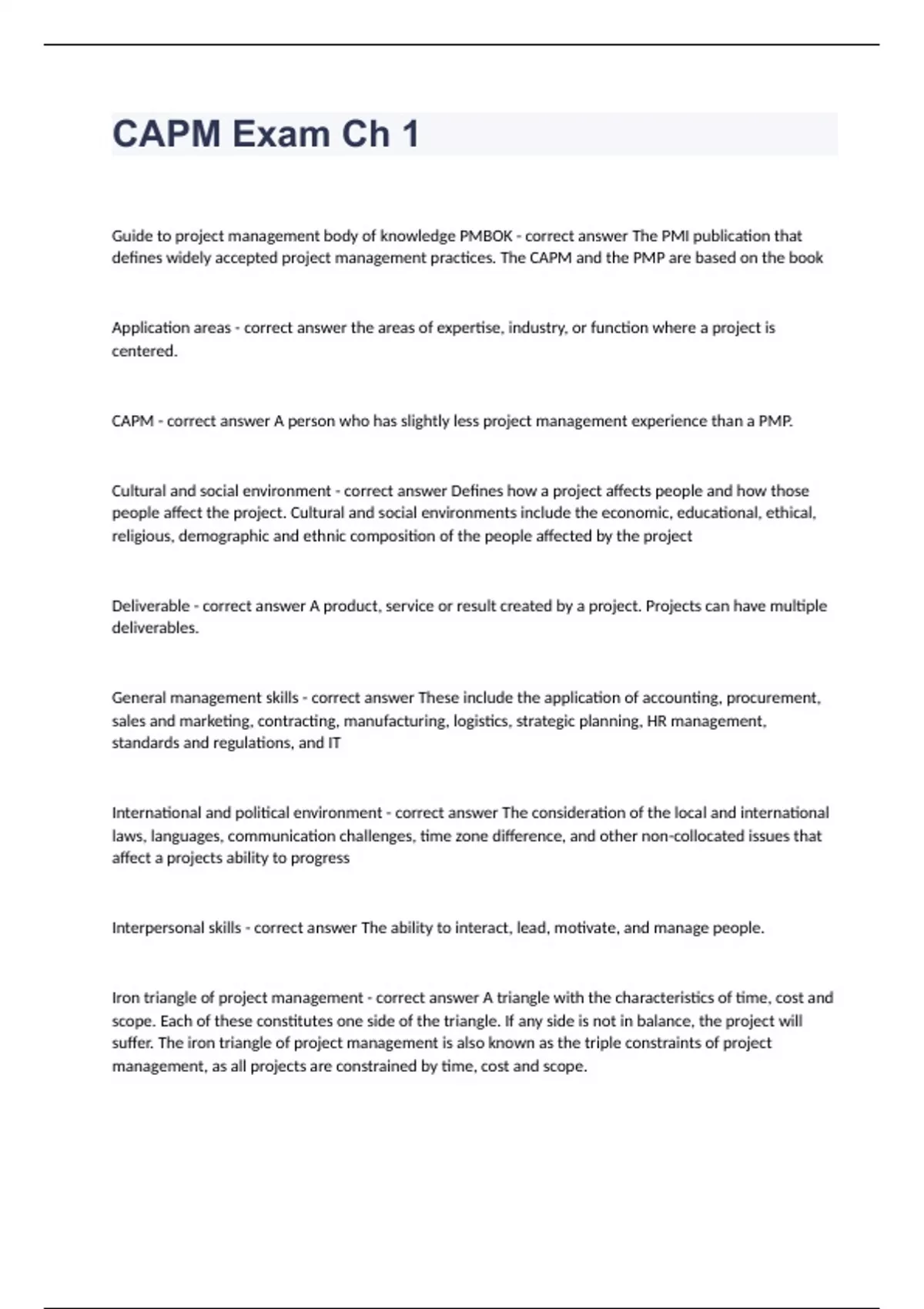 CAPM Exam Ch 1 Question and answers 100% correct 2023/2024Guide to project management body of knowledge PMBOK - correct answer The PMI publication that defines widely accepted project management practices. The CAPM and the PMP are based on the book Application areas - correct answer the areas of expertise, industry, or function where a project is centered. CAPM - correct answer A person who has slightly less project management experience than a PMP. Cultural and social environment - correct answer Defines how a project affects people and how those people affect the project. Cultural and social environments include the economic, educational, ethical, religious, demographic and ethnic composition of the people affected by the project Deliverable - correct answer A product, service or result created by a project. Projects can have multiple deliverables.