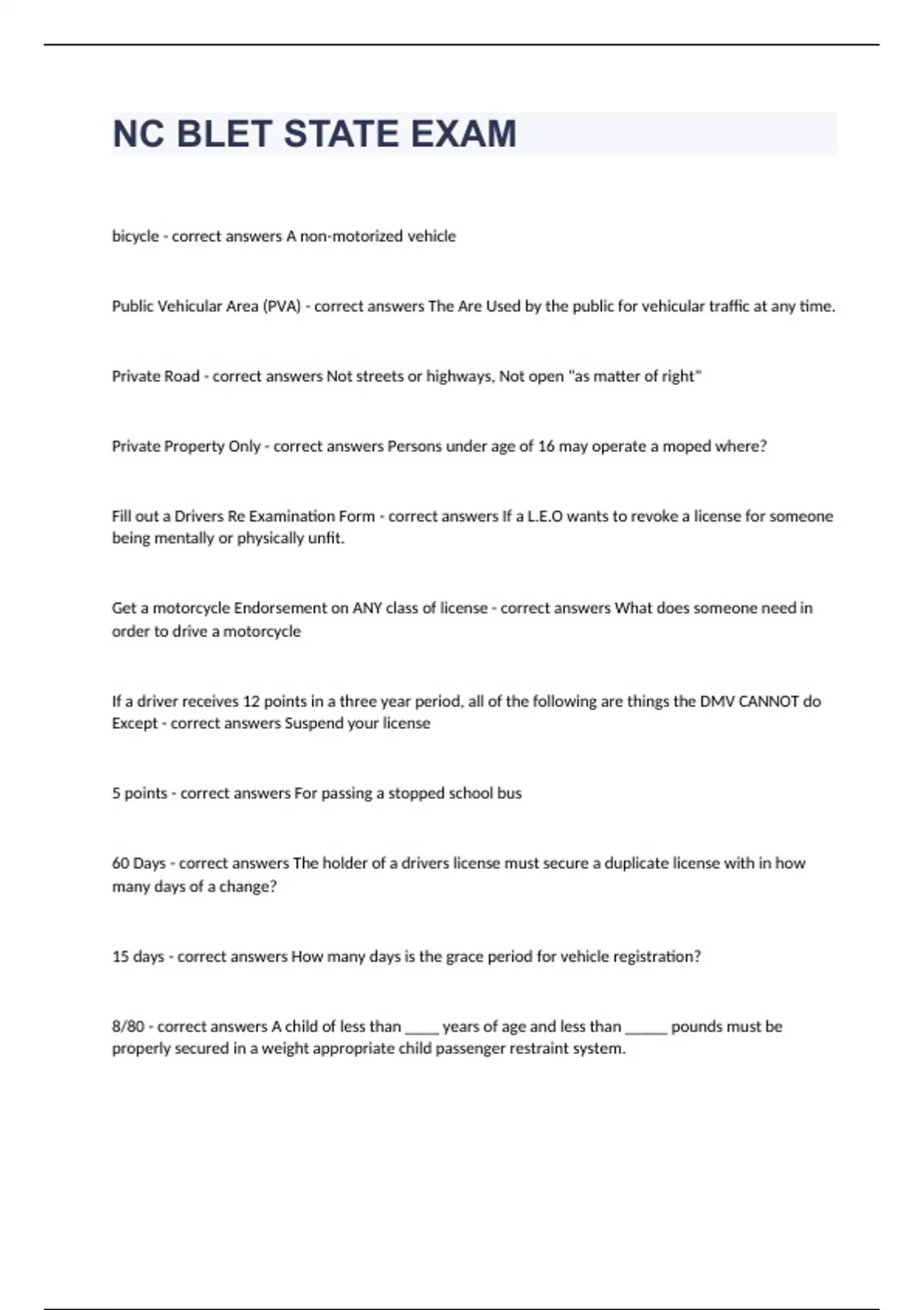 NC BLET STATE EXAMbicycle - correct answers A non-motorized vehicle Public Vehicular Area (PVA) - correct answers The Are Used by the public for vehicular traffic at any time. Private Road - correct answers Not streets or highways, Not open "as matter of right" Private Property Only - correct answers Persons under age of 16 may operate a moped where? Fill out a Drivers Re Examination Form - correct answers If a L.E.O wants to revoke a license for someone being mentally or physically unfit. Get a motorcycle Endorsement on ANY class of license - correct answers What does someone need in order to drive a motorcycle If a driver receives 12 points in a three year period, all of the following are things the DMV CANNOT do Except - correct answers Suspend your license 5 points - correct answers For passing a stopped school bus 60 Days - correct answers The holder of a drivers license must secure a duplicate license with in how many days of a change? 15 days - correct answers How many days is the grace period for vehicle registration? 8/80 - correct answers A child of less than ____ years of age and less than _____ pounds must be properly secured in a weight appropriate child passenger restraint system. Felony Speeding to Elude Arrest - correct answers Most Serious Speeding Offense 0.01 - correct answers Driving privileges will be revoked immediately for at least 30 days if the defendant is under 21 and any test reveals an alcohol concentration above. 3/10 - correct answers The person is guilty of habitual impaired driving when the person has been convicted of _ or more offenses involving impaired driving within _ years of the date of the offense. Vigilance Problems - correct answers - driving in opposing lanes or wrong way on a one-way street - slow response to traffic signals - slow or failure to respond to officer's signals - stopping in lane for no apparent reason - driving without headlights - failure to signal or signal inconsistent with action Check stations and roadblocks - correct answers Used to produce driver's license, registration, and proof of insurance. 6 - correct answers Different classes of driver's licenses Narcotics - correct answers Class of drugs that act on the central nervous system and can produce a sleep like state and reduce pain, and inflammation. Schedule 1 drugs - correct answers Most dangerous drugs that have NO medical purpose. Schedule 6 - correct answers Marijuana, drug derived from the cannabis plant, is what schedule drug? Narcotics - correct answers Pin point pupils, itching or flushed skin, sleepiness, skin prickling, and confusion or poor judgement. Methamphetamine cycle - correct answers rush, high, BINGE, tweaking, crash Super Lab - correct answers Large, highly organized lab that can manufacture 10 or more pounds of methamphetamine per production cycle. NPLEx - correct answers North Carolina state law requires every pseudoephedrine or ephedrine transaction be entered into a database called. coffee filter - correct answers a common item found at an improvised lab safety - correct answers When you discover a meth lab _ must be first and foremost in your mind. blue - correct answers Brass valves on a gas cylinder or tanks that contains anhydrous ammonia will be what color? SBI - correct answers it is mandatory to contact which agency when a meth lab is discovered. Unsecured - correct answers Search incident to arrest may occur automatically only when the person is _and within reaching distance of the passenger compartment at the time the search is conducted. Race of the person - correct answers Articulable facts supporting reasonable suspicion for suspecting sone was involved in a crime EXCEPT No charge for drug paraphernalia or residual amounts of drugs - correct answers Prior to search, a person informs the officer of a hypodermic needle or other sharp object that may cut or puncture the officer, what does the officer do? State - correct answers Where an arrest warrant is valid petition - correct answers 1st amendment protects a persons freedom of speech, religion, assembly, press, and ___ time, place, and manner - correct answers Freedom of speech may be restricted in what ways? DA/Judge - correct answers Applies for a warrant in the case and issues it. Follow your own departments policies governing pursuits - correct answers When pursuing a vehicle and are about to leave your jurisdiction, armed and dangerous - correct answers You may frisk a person you believe is